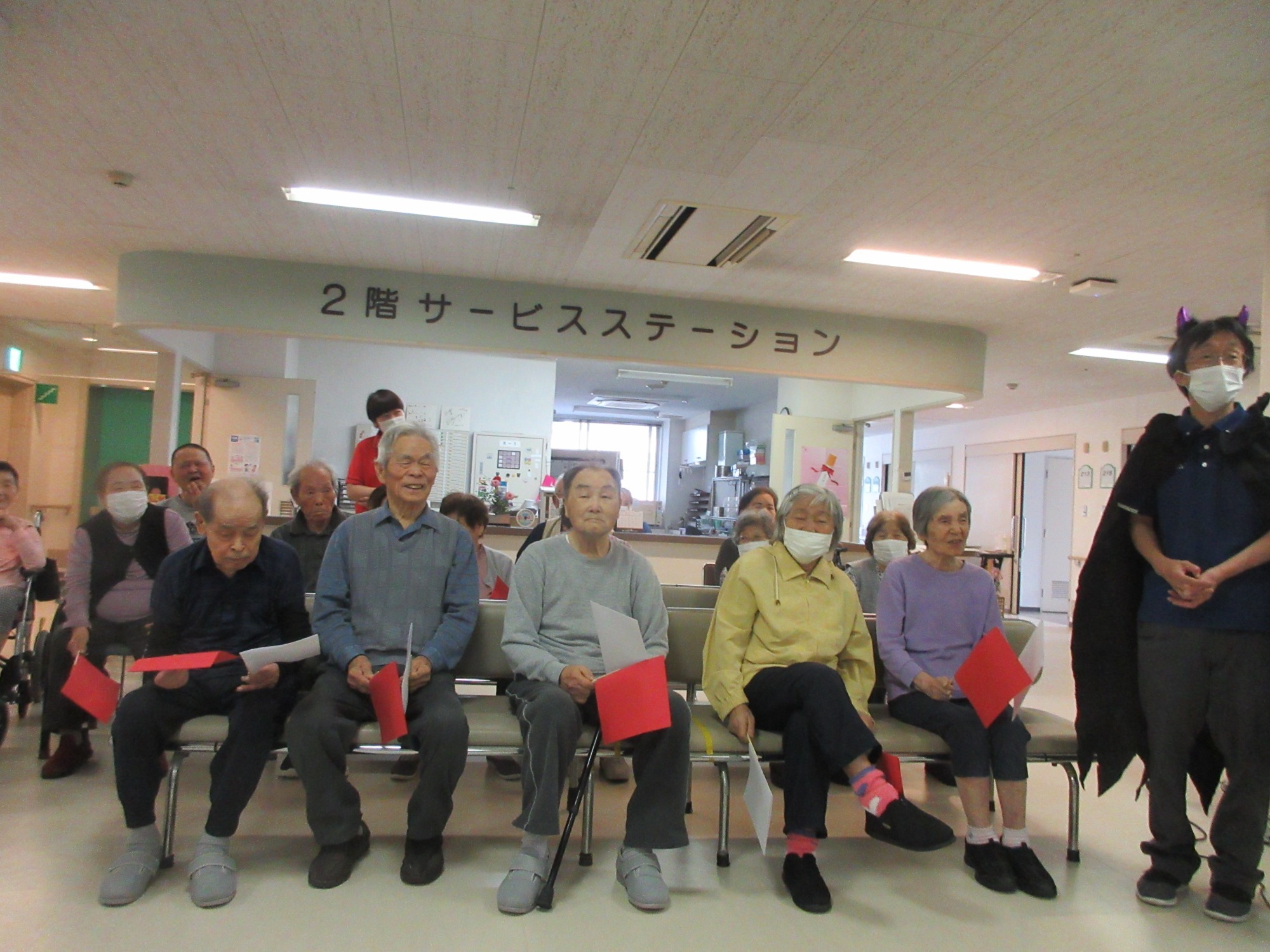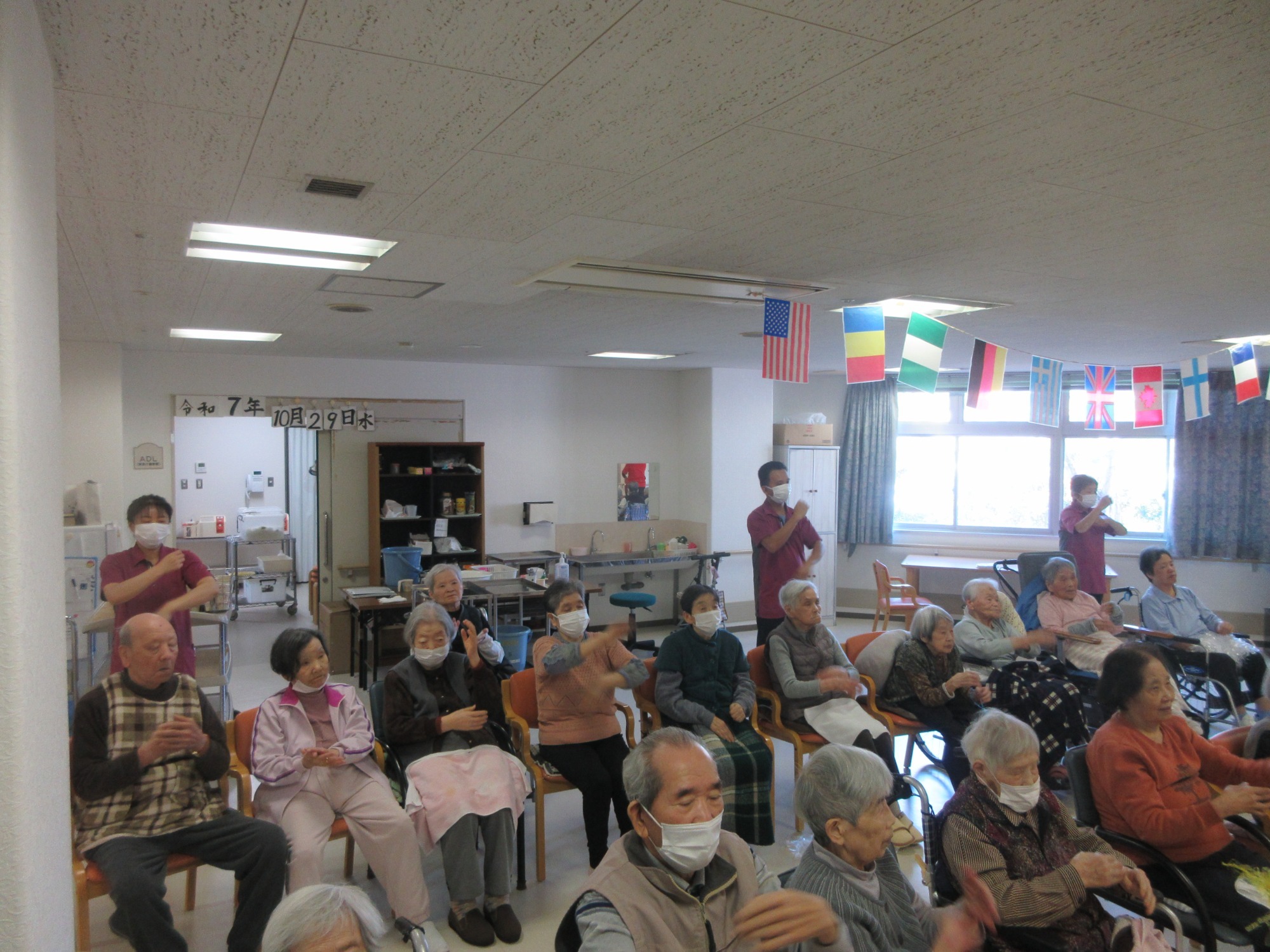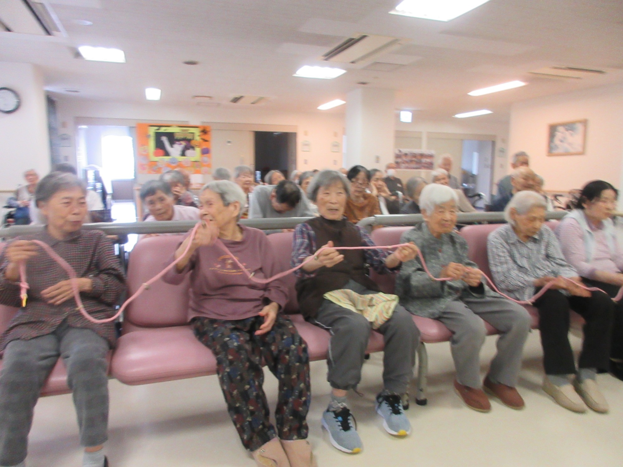また、音楽レクの途中で昔の遊びの話になり、「かごめかごめ」をスタッフで実演して、皆さんに見てもらうと大変喜ばれました。次回の誕生日会は、クリスマスの日になります。お楽しみに!