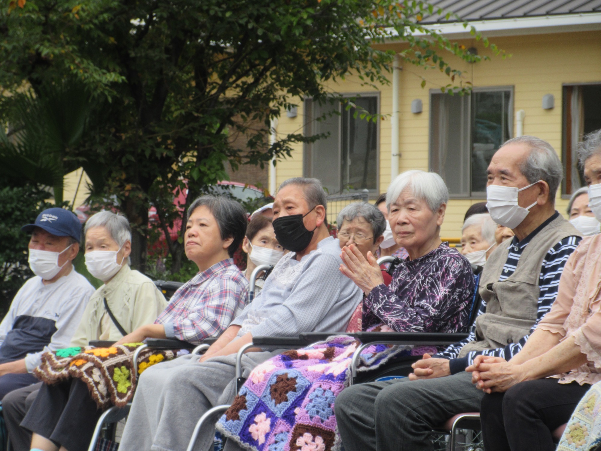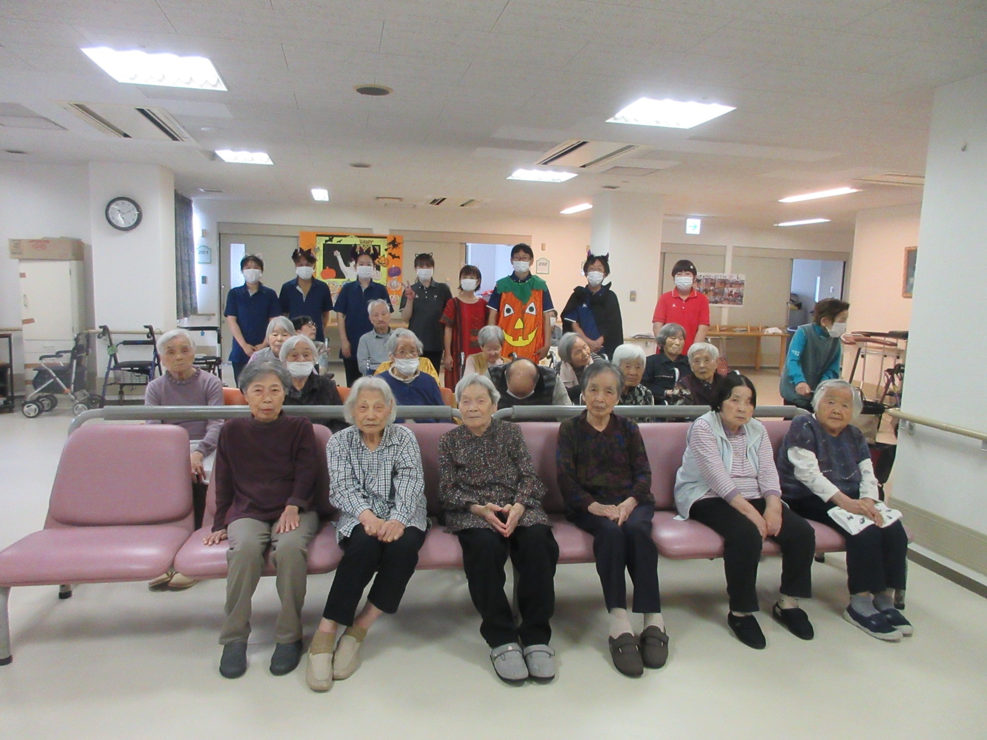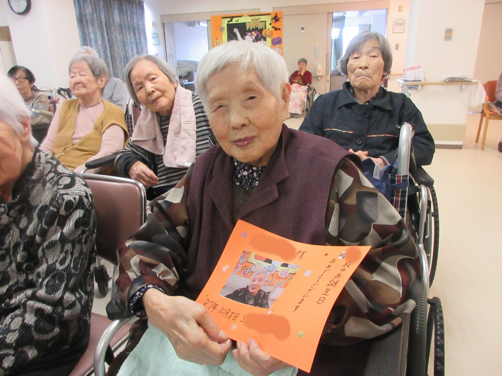 また、音楽レクの途中で昔の遊びの話になり、「かごめかごめ」をスタッフで実演して、皆さんに見てもらうと大変喜ばれました。次回の誕生日会は、クリスマスの日になります。お楽しみに!