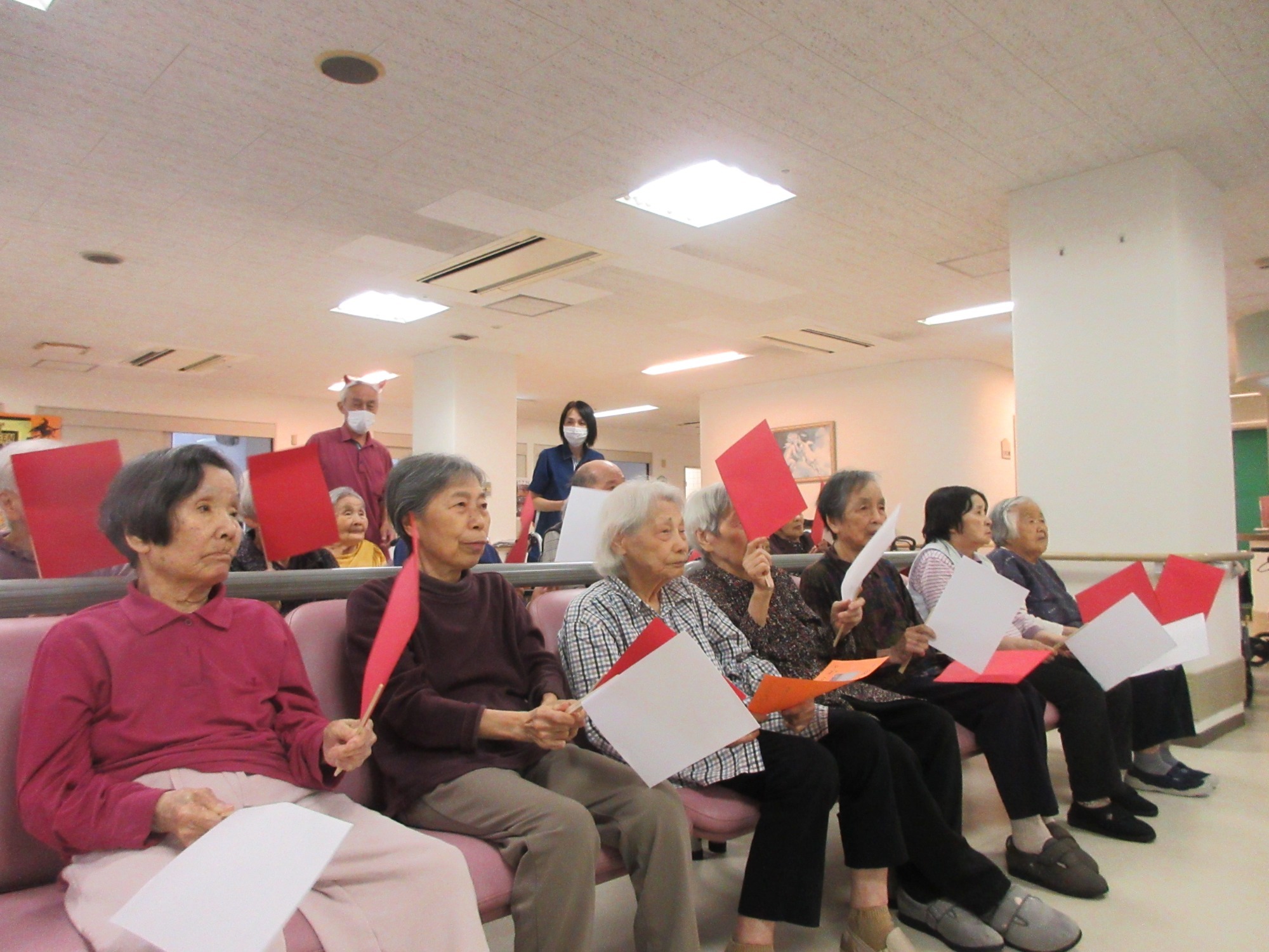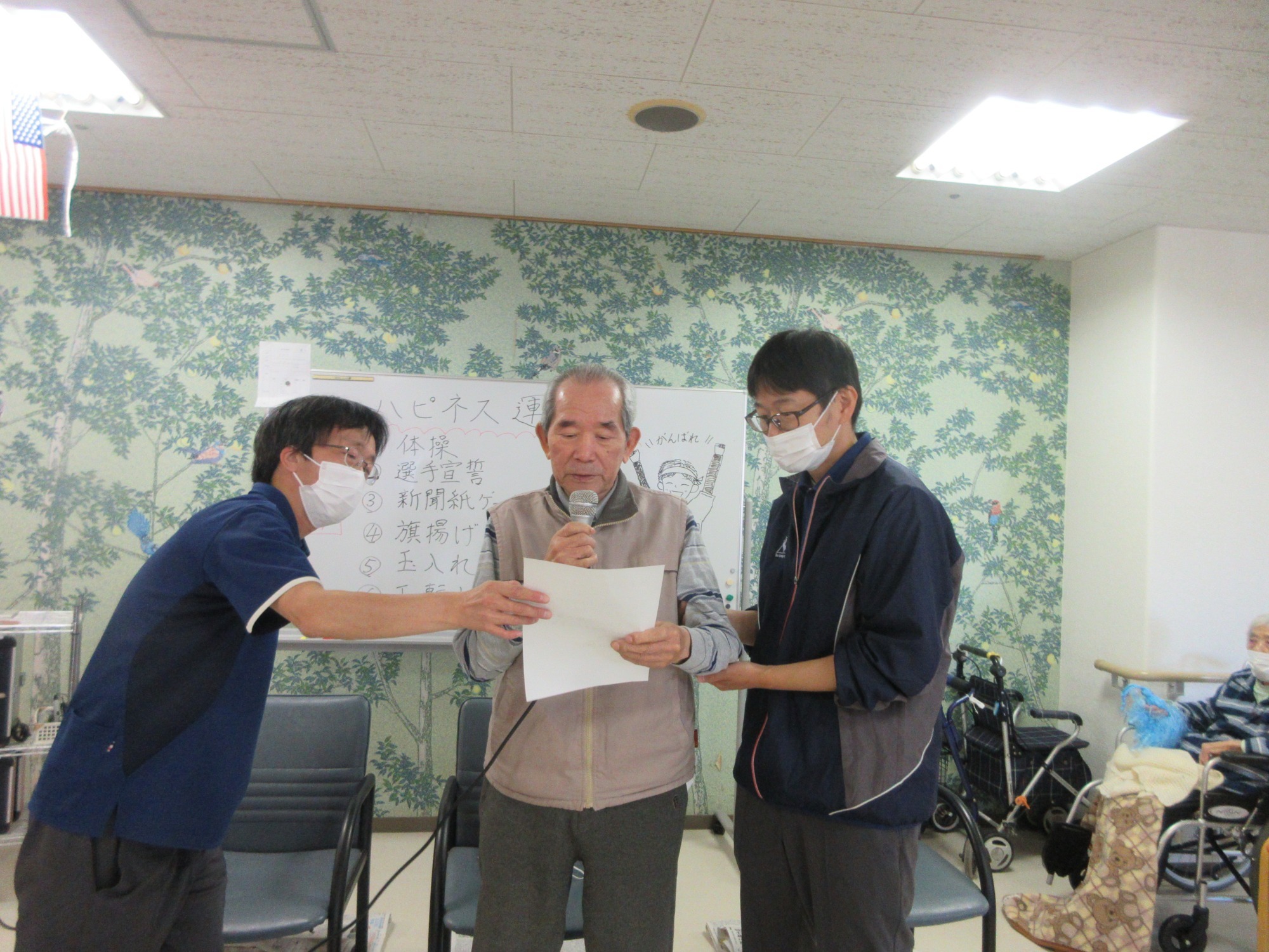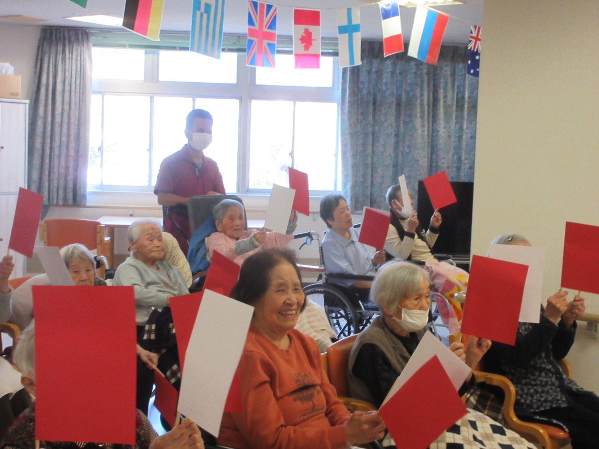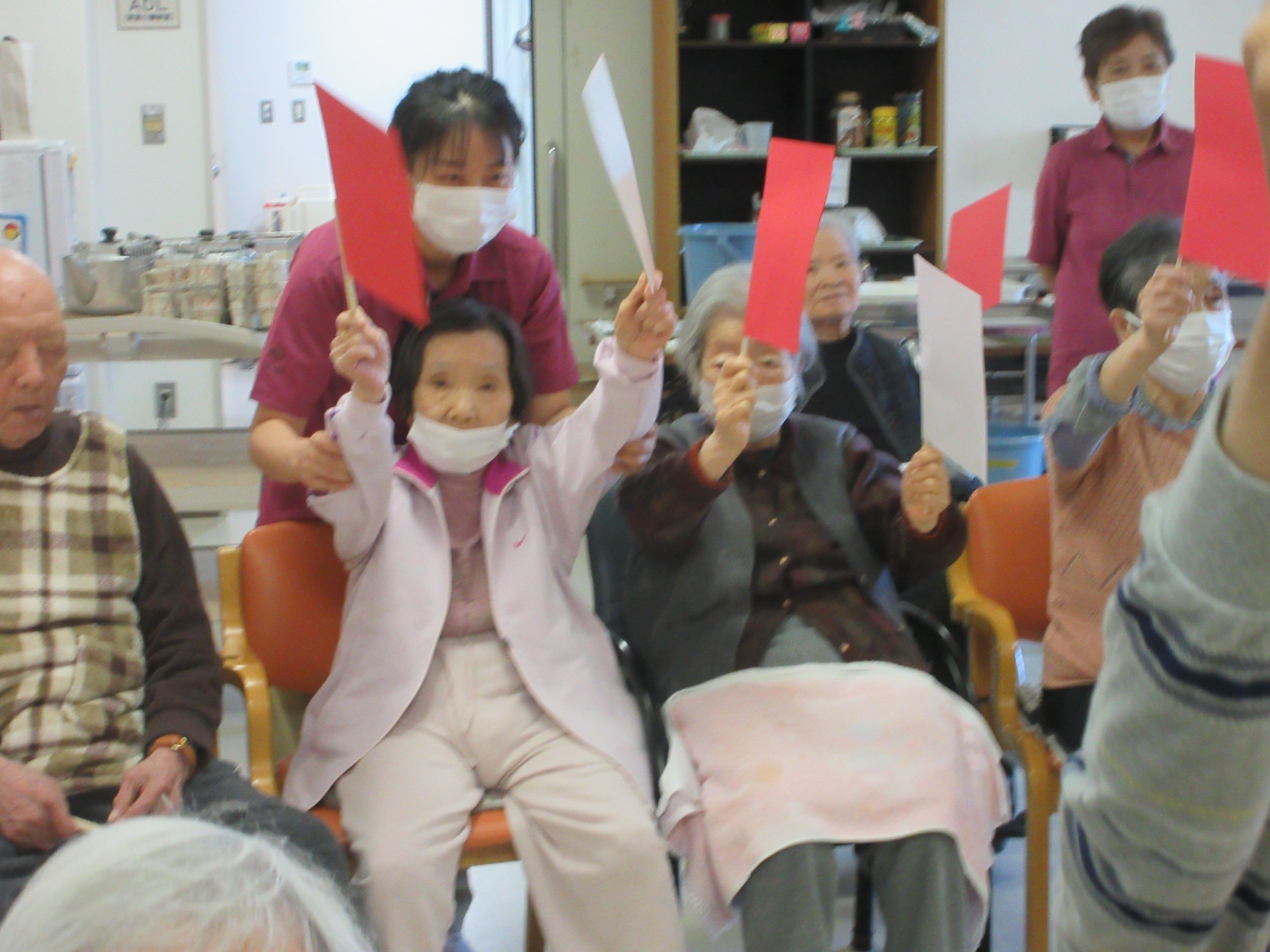 選手代表の方に元気よく選手宣誓をしてもらった後、色々なゲームに参加していただきました。やはり運動会は、皆を元気にしてくれるようで、いつもより笑い声も大きく、楽しんでいただけたようです。「旗揚げ」も練習した成果がでていて、全体の正解率も高くなっていました。沢山体を動かして、頭も使っていただいたので、今日は良い夢が見れると思います。皆さま、お疲れ様でした。
