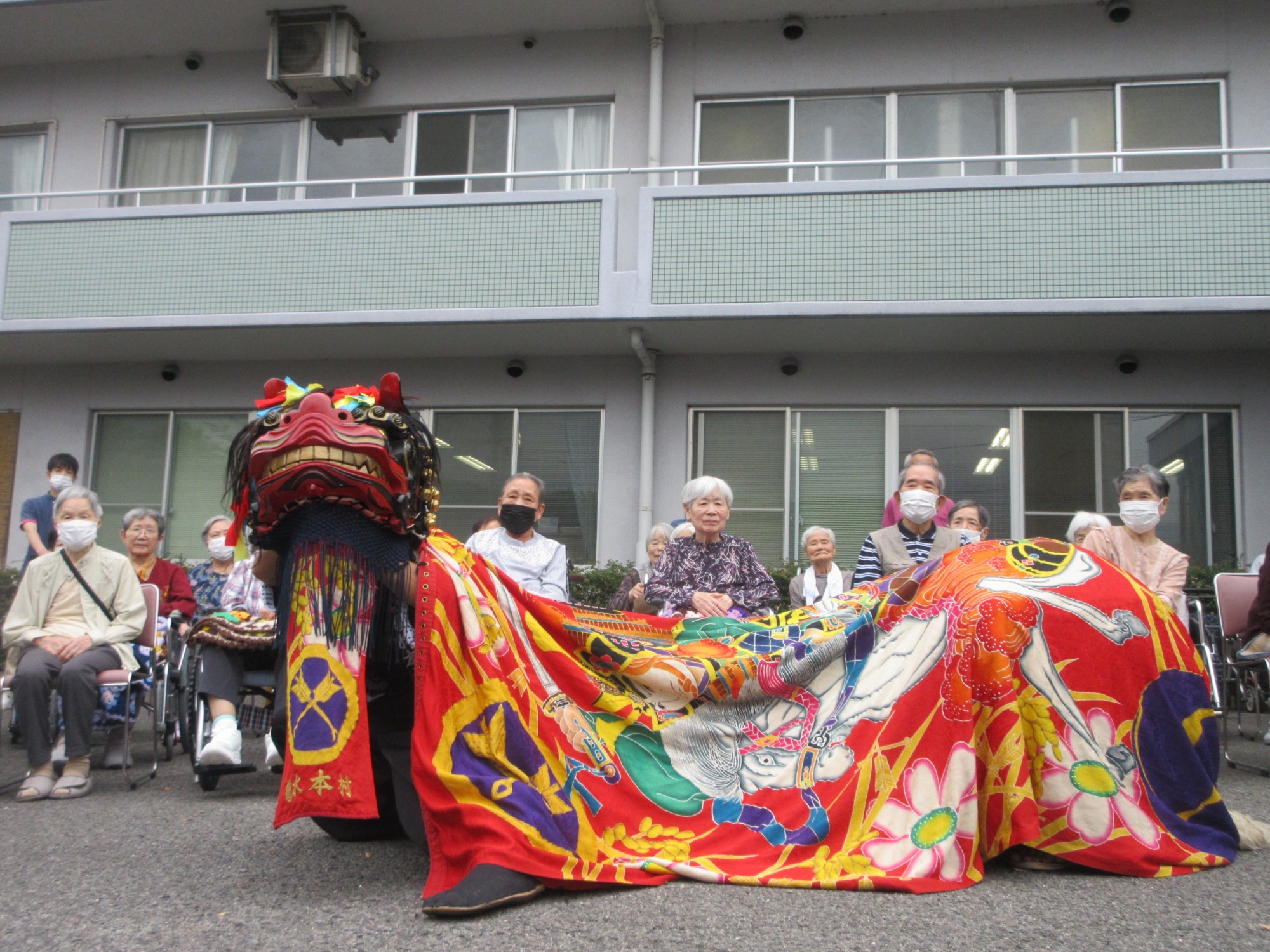 この時期に「天下泰平」と「五穀豊穣」を願って獅子舞が奉納されます。今日は、「神在川窪」の皆さんが施設へお越しになりました。また、在宅サポートや五色の里からも獅子舞を見にご利用者様がやってきてくださいました。