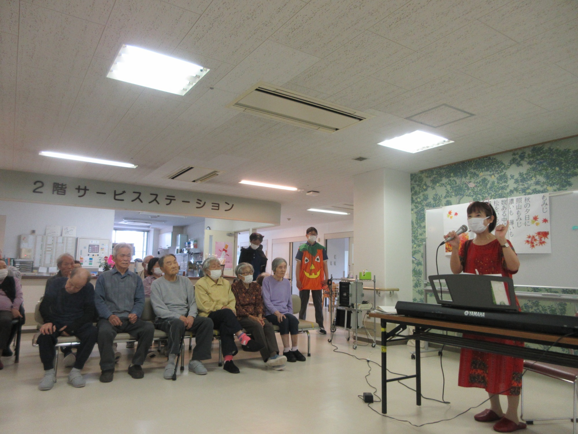 アメリカの子供達がこの時期、歌っている童謡で「TRICK OR TREAT」という曲があるのですが、日本語訳に直して、皆で歌ってみました。発音よく英語で「トリック オア トリート」と言うと、皆さん「????」と困ってしまった状態になられたので、カタカナで和製英語で発音すると、後に続いてくれました。その歌を使用して食べ物ゲームをしたり、「お化けなんてないさ」を歌ったり、溝渕先生がシューベルトの「魔王」をピアノで弾いてくださり、ハロウィーンを演出してもらいました。「ハロウィーンて何?」から始まり、皆さんにとって馴染みのない西洋の行事は、覚えずらい事から関心度も低い方が多かったのですが、ゲームや歌は楽しんでいただけたようです。