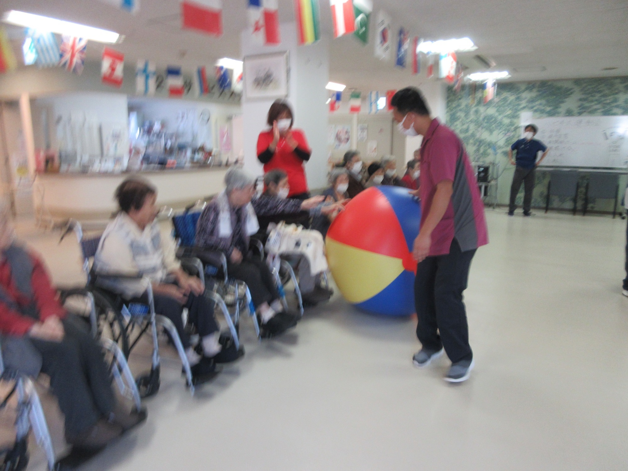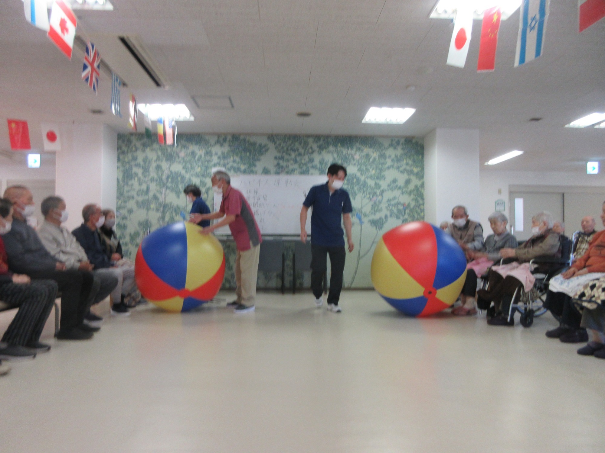 やっと涼しくなり、運動に最適な季節になりましたが、「高齢者の皆様には外での運動会は風が冷たいのでは?」という事で、せっかくの晴天でしたが、今年も室内運動会を開催する事になりました。