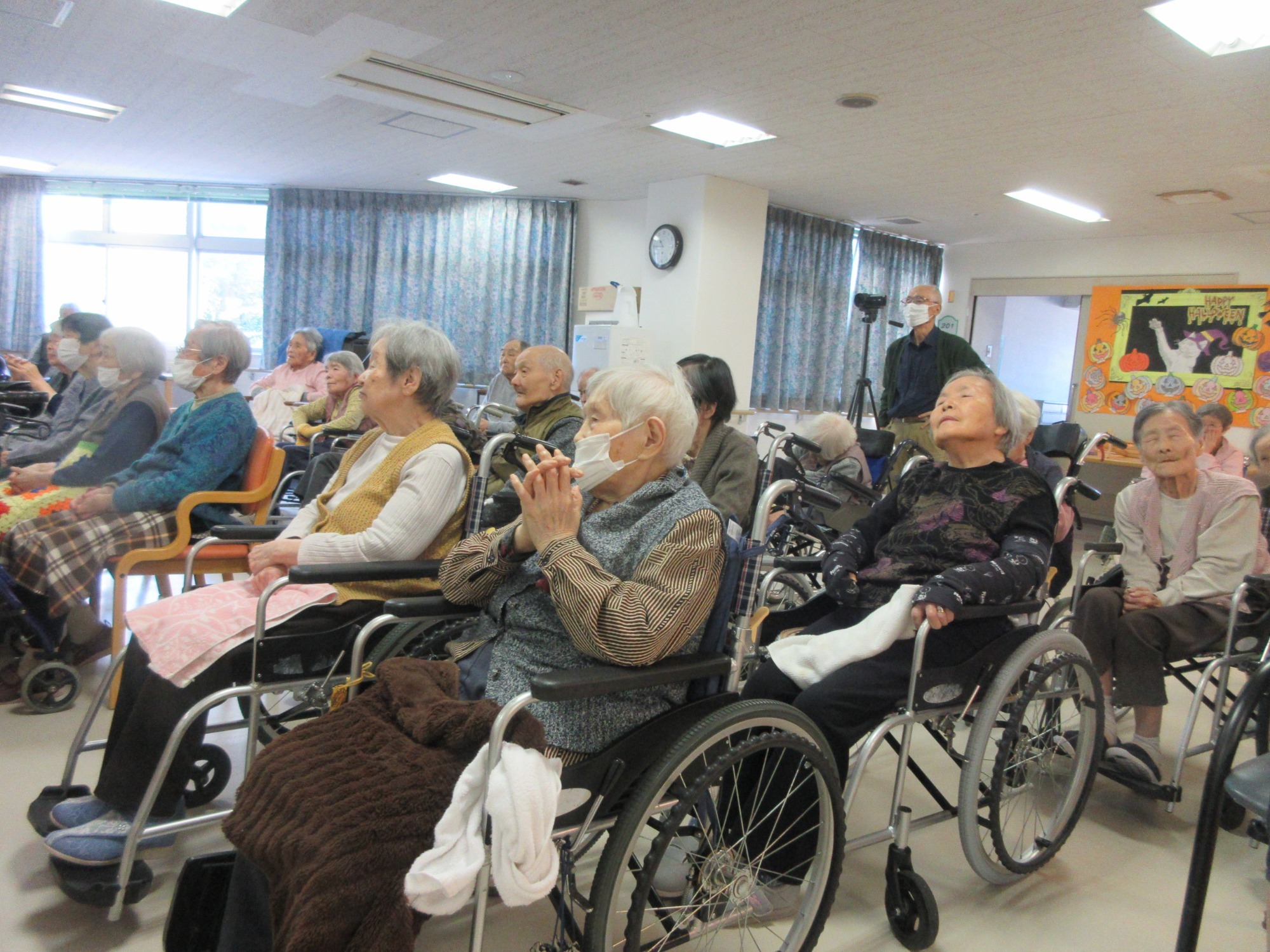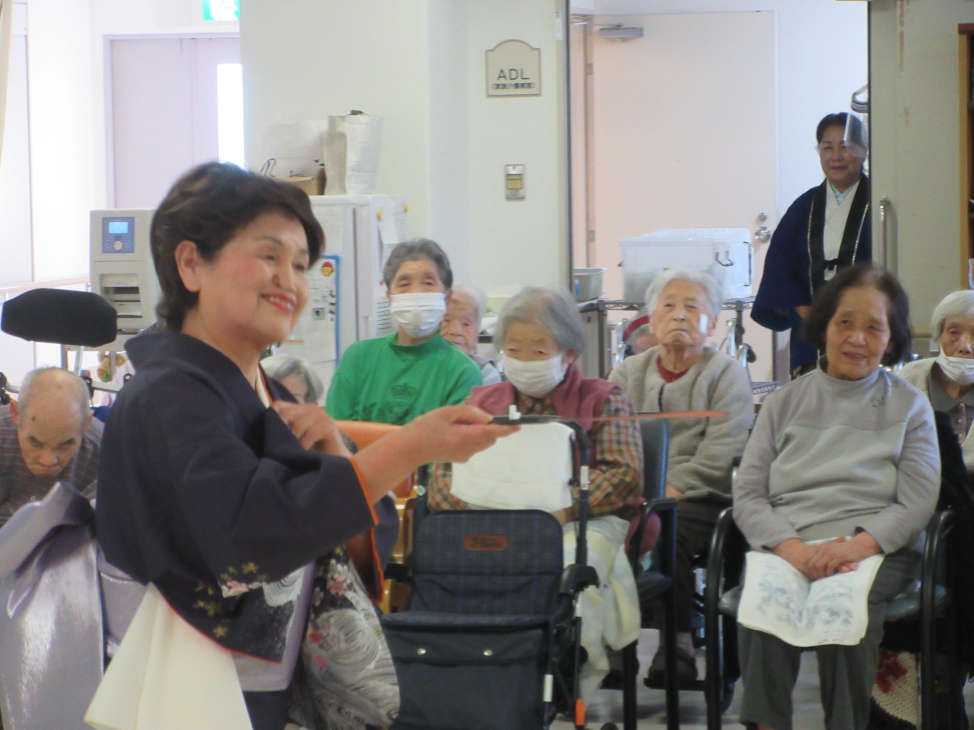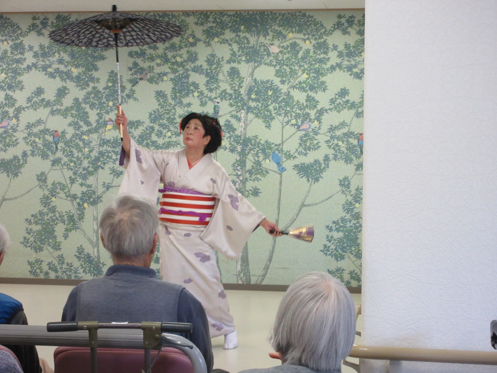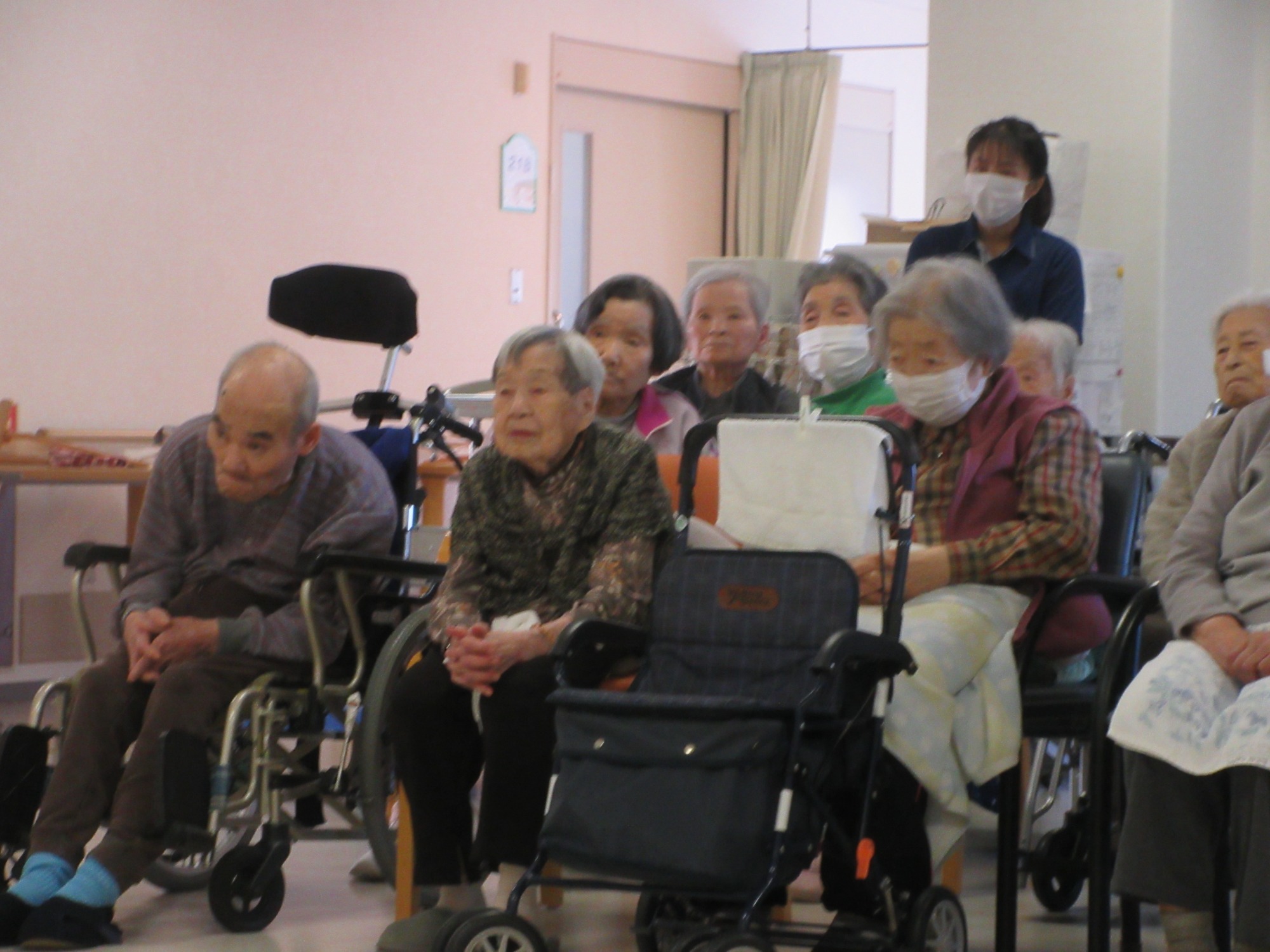 また、「壺阪物語」という「盲人とその妻の夫婦愛を描いた物語」を曲に合わせて踊っていただきました。お芝居がお好きな方達は、真剣な顔で劇を見ていらっしゃいました。こういったイベント事の最中に、面会でお越しくださったご家族様は、一緒に見学されて楽しまれる方もいらっしゃいます。ご家族の皆様、是非ご参加くださいませ。
