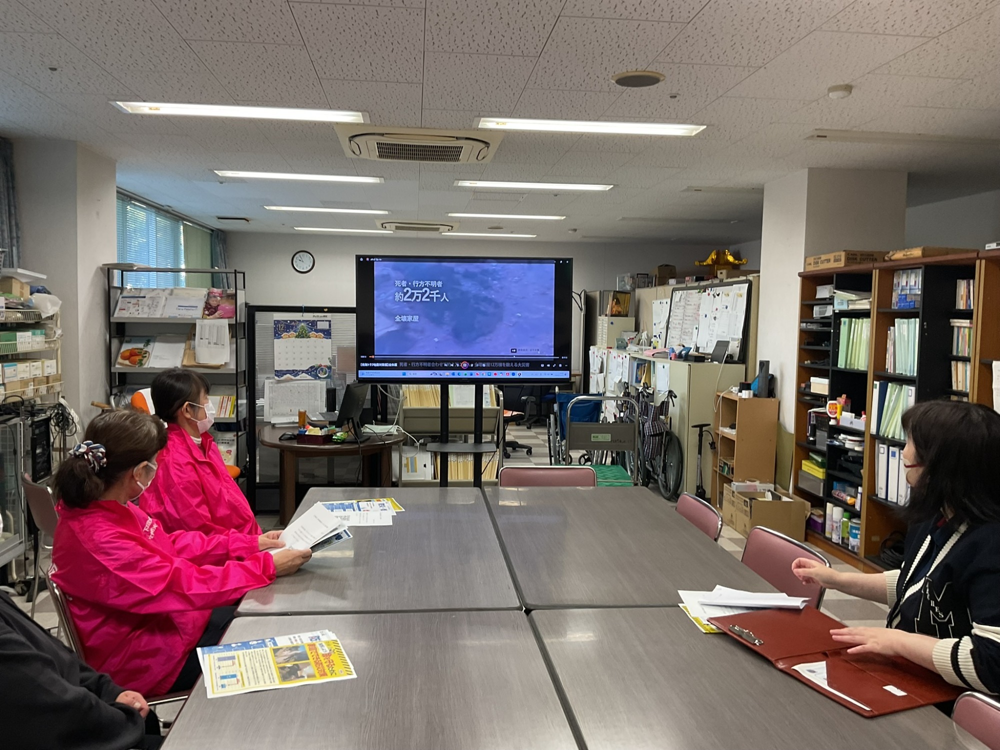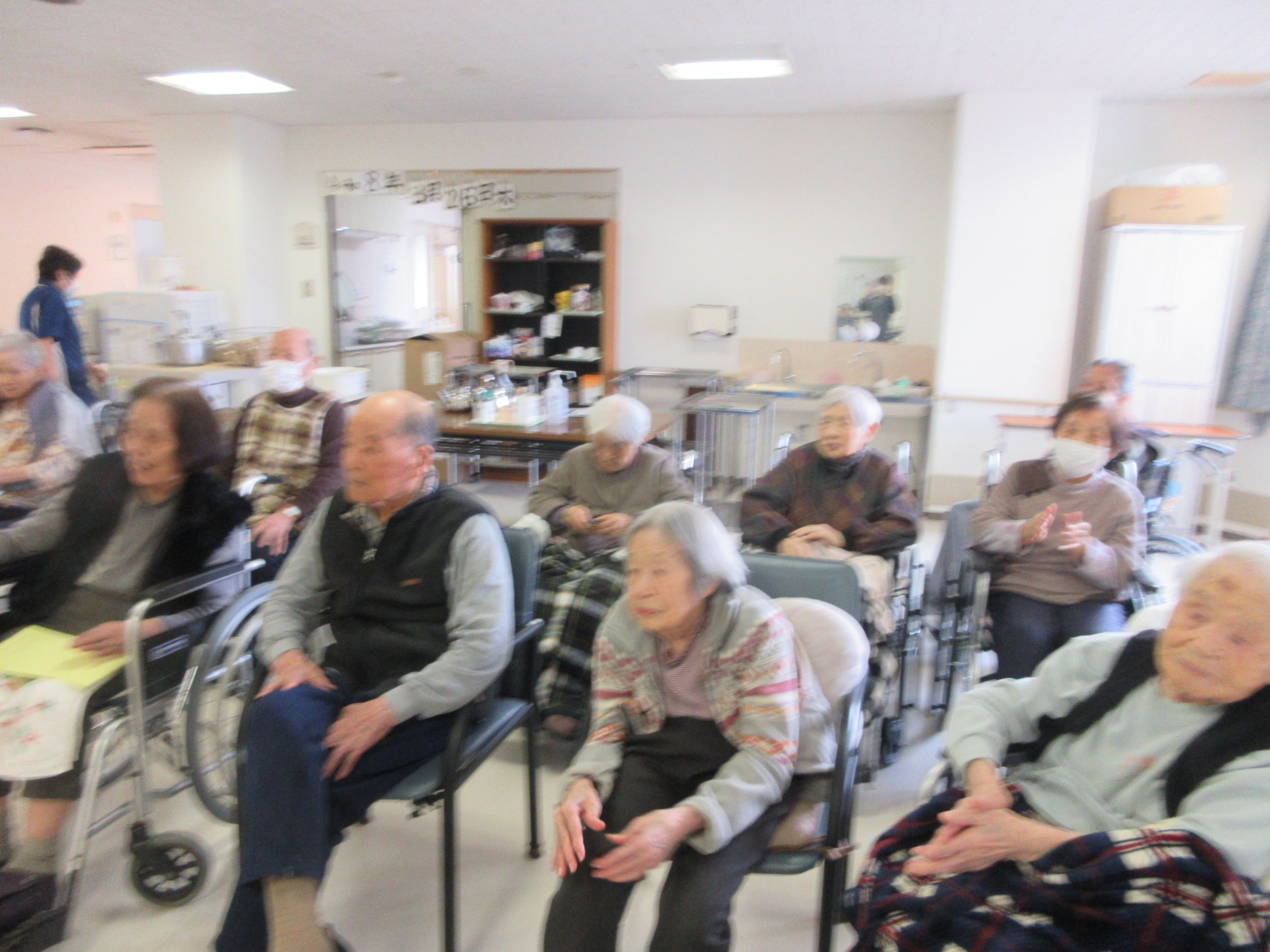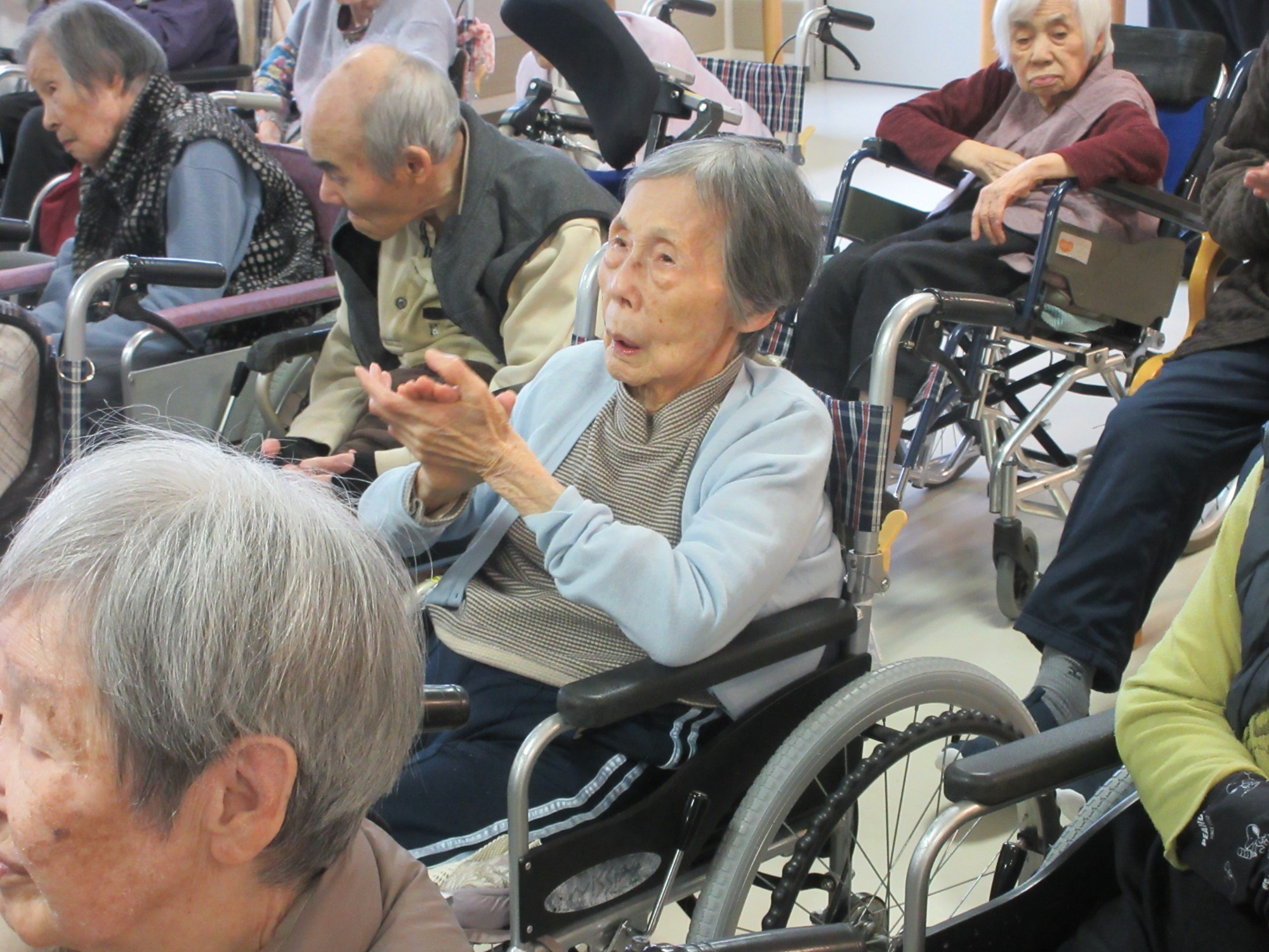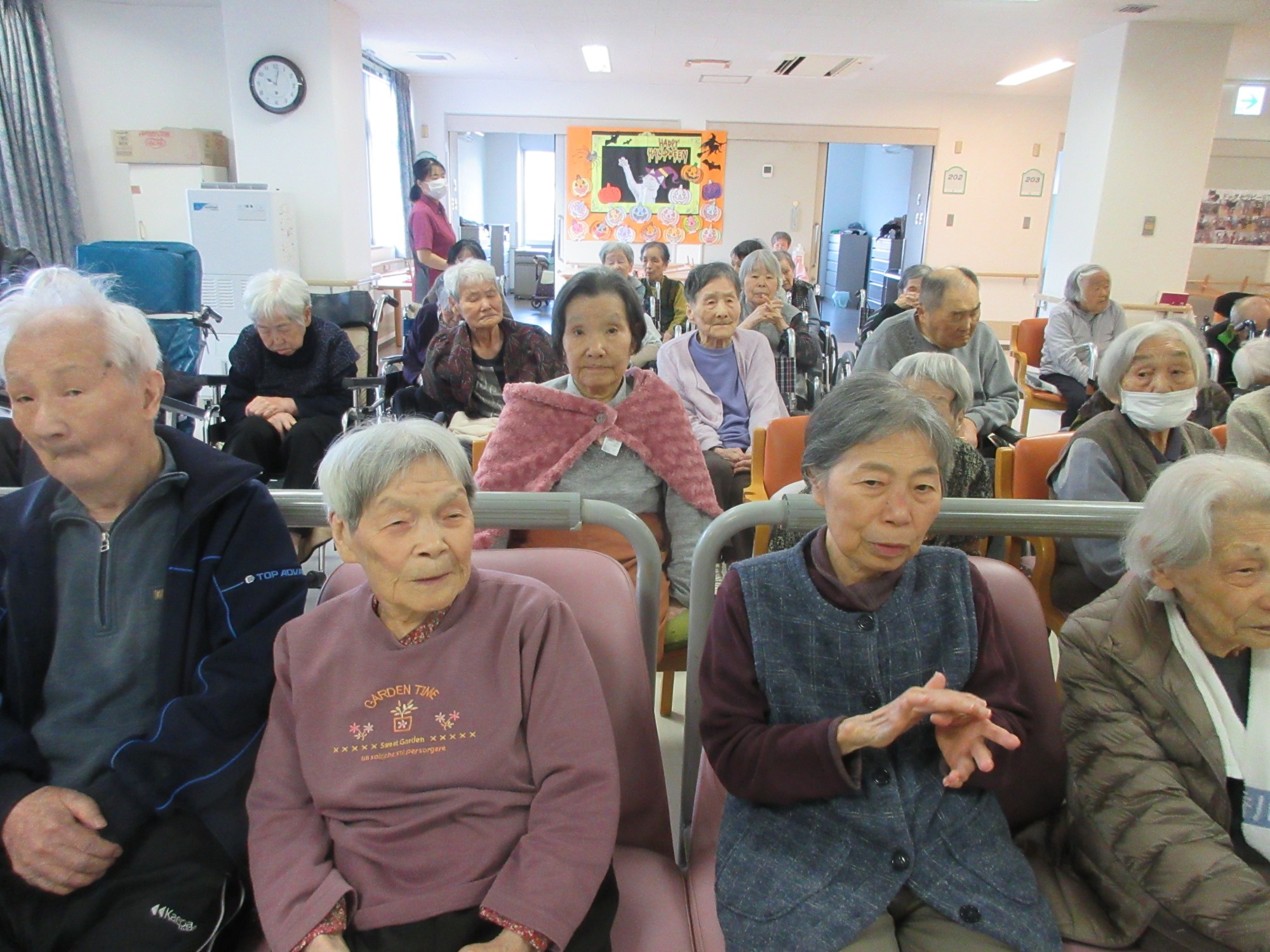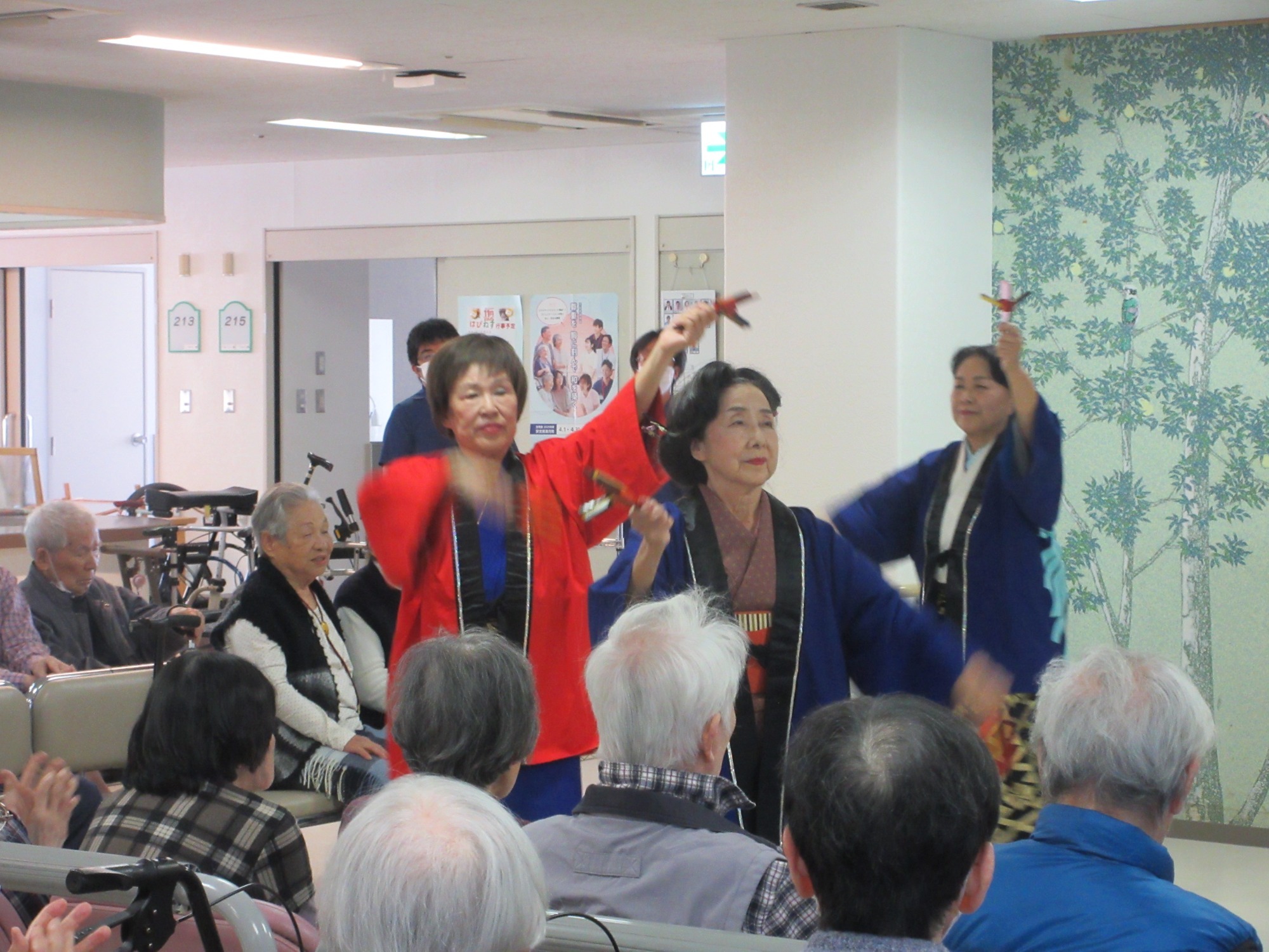 また、「壺阪物語」という「盲人とその妻の夫婦愛を描いた物語」を曲に合わせて踊っていただきました。お芝居がお好きな方達は、真剣な顔で劇を見ていらっしゃいました。こういったイベント事の最中に、面会でお越しくださったご家族様は、一緒に見学されて楽しまれる方もいらっしゃいます。ご家族の皆様、是非ご参加くださいませ。