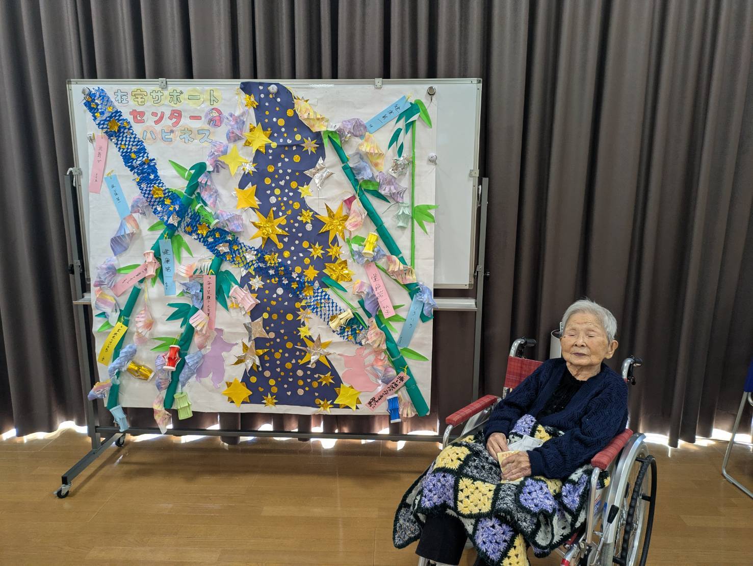 スイカ割りの後は短冊に「健康第一」などと、お願い事を書かれて飾りつけを行いました。