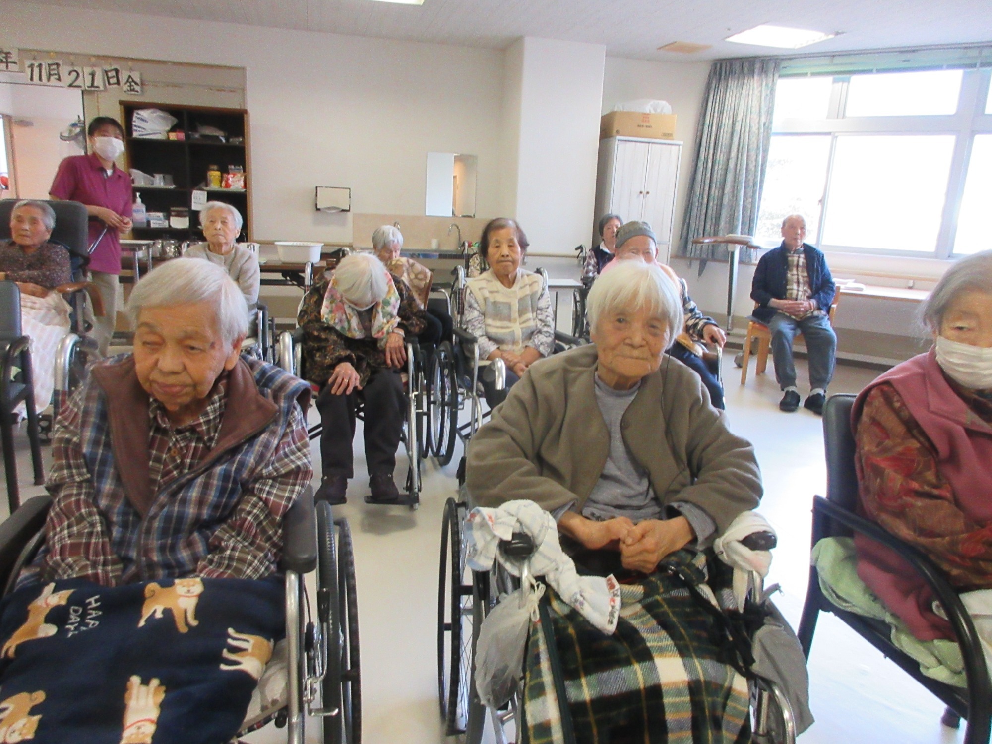 誕生日会の次の日の11月22日は「良い夫婦の日」で「いい(11)ふうふ(22)」と読む事ができます。カップルや夫婦は「絆を深めましょう」という意味を込めて、歌う曲も夫婦に因んだ曲を選択し、皆さんと一緒に楽しく歌いました。手遊び歌もチャレンジしてもらい、皆さん上手に真似て体を動かしてくださいました。