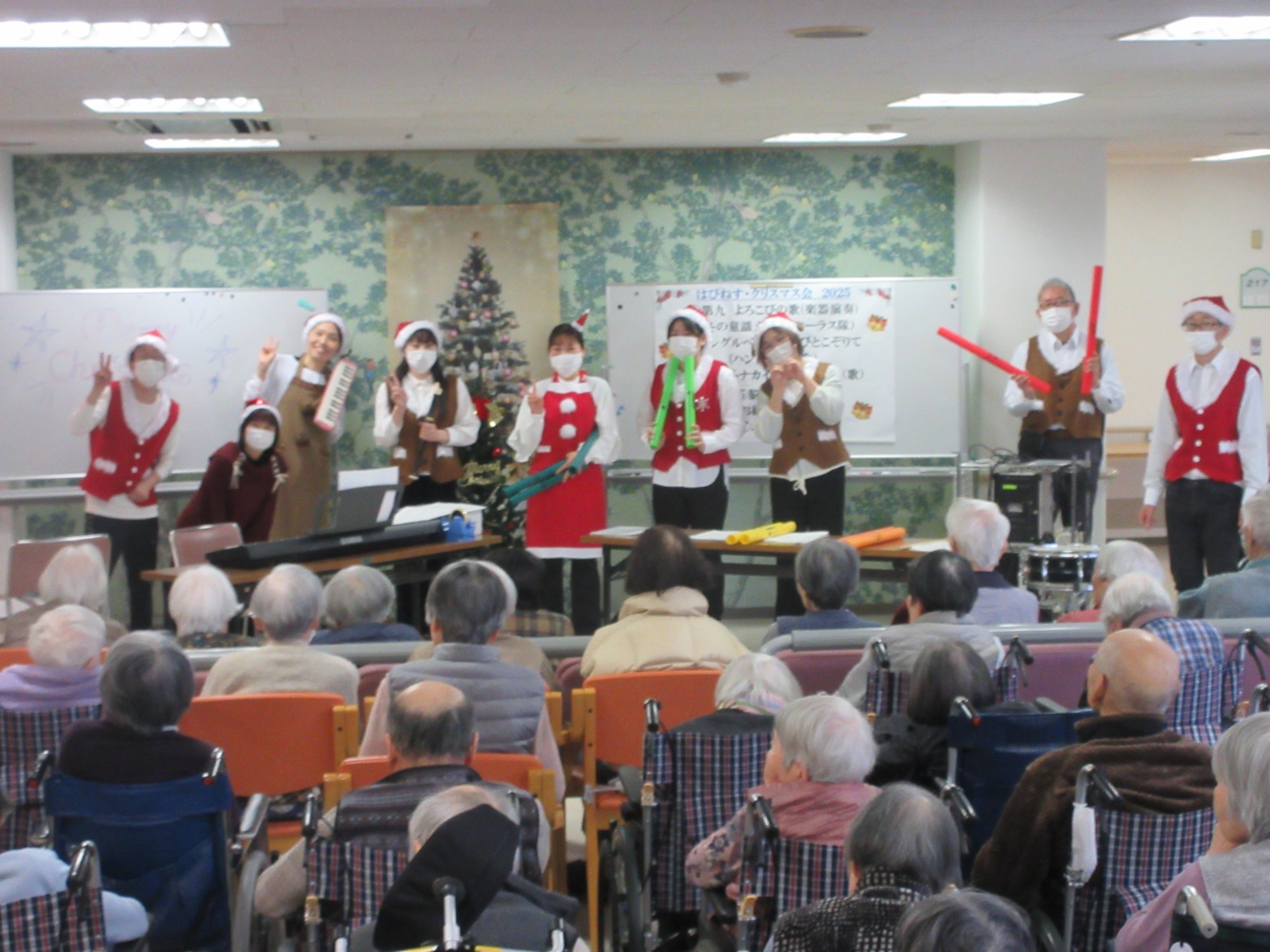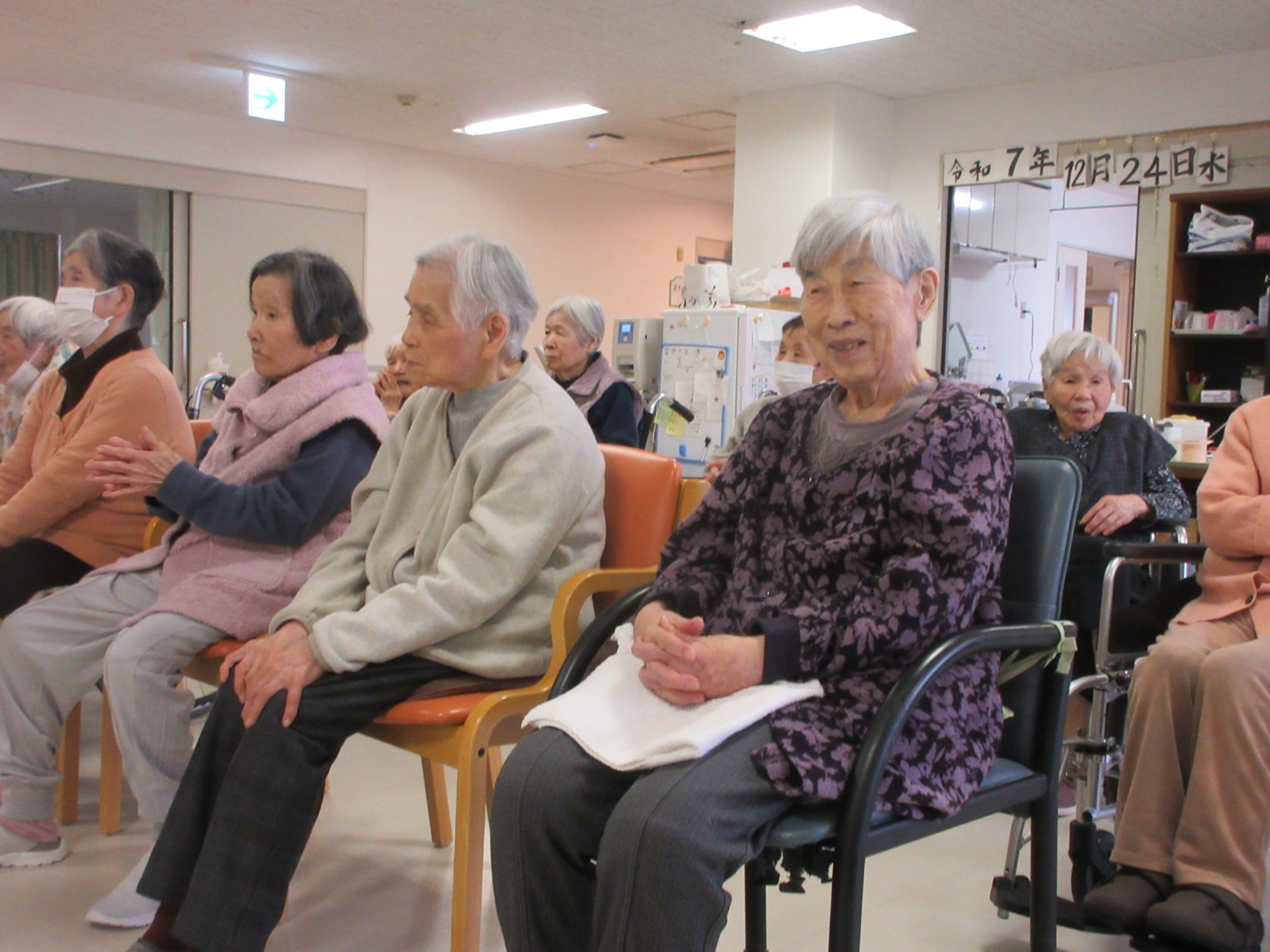 日頃の練習の成果を聞いていただき、皆さんから盛大な拍手をいただきました。「馴染みのある童謡なので、聞きやすかった。上手に歌ってたね」とお褒めの言葉もいただきました。また、「お絵描きゲーム」というゲームでは、クリスマスのワードを書いた紙を見て、絵を描く人達はそのお題に従って絵を描き、皆さんに何の絵を描いたのかを当ててもらうゲームをしました。絵が苦手な方の絵は、とても個性的で、皆さんに沢山笑っていただきました。今年も後僅かとなりましたが、来年も安全を第一に、そして皆様に沢山笑って過ごしていただけるよう、職員一同頑張ります。