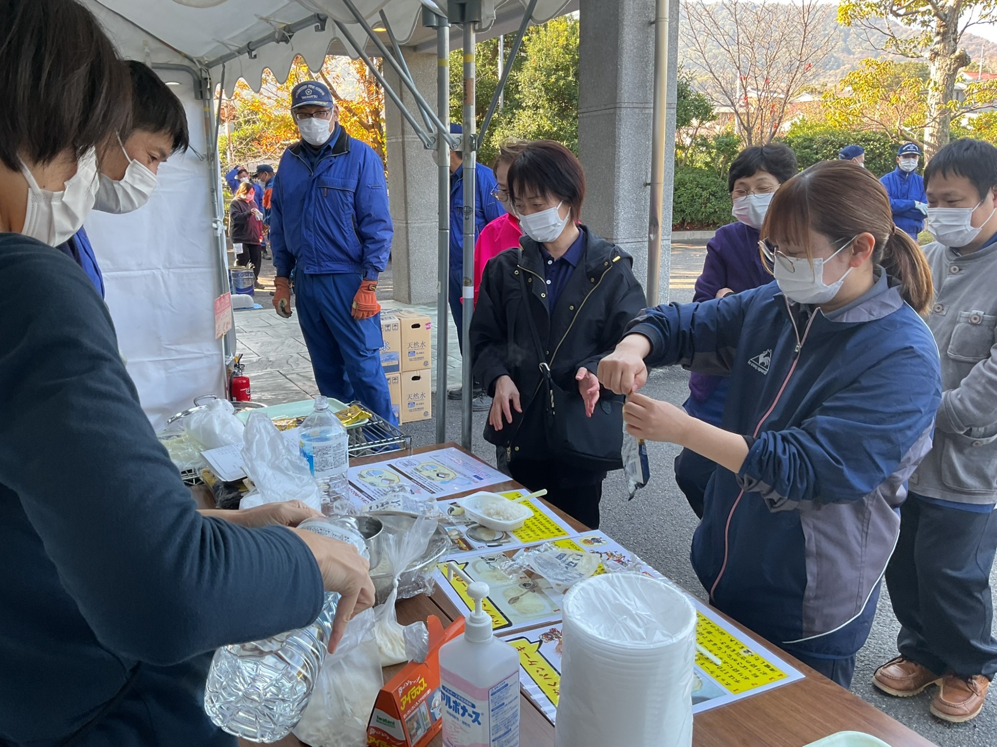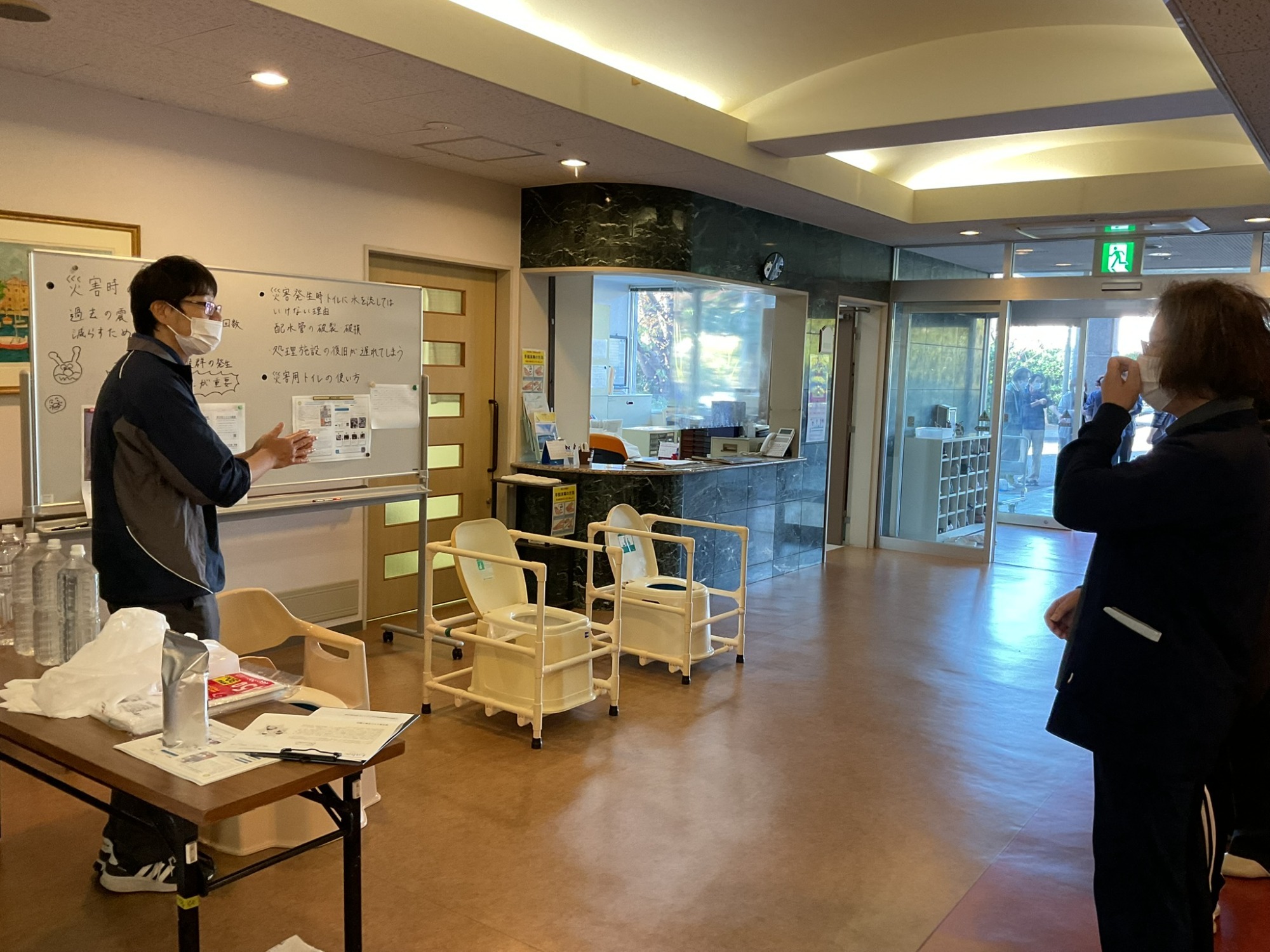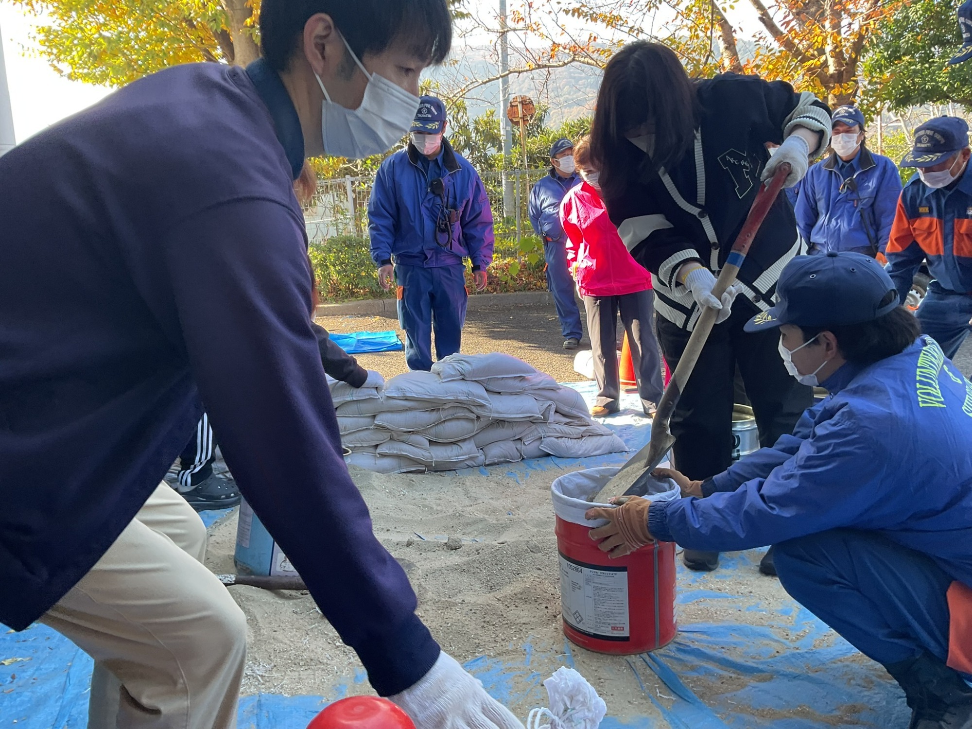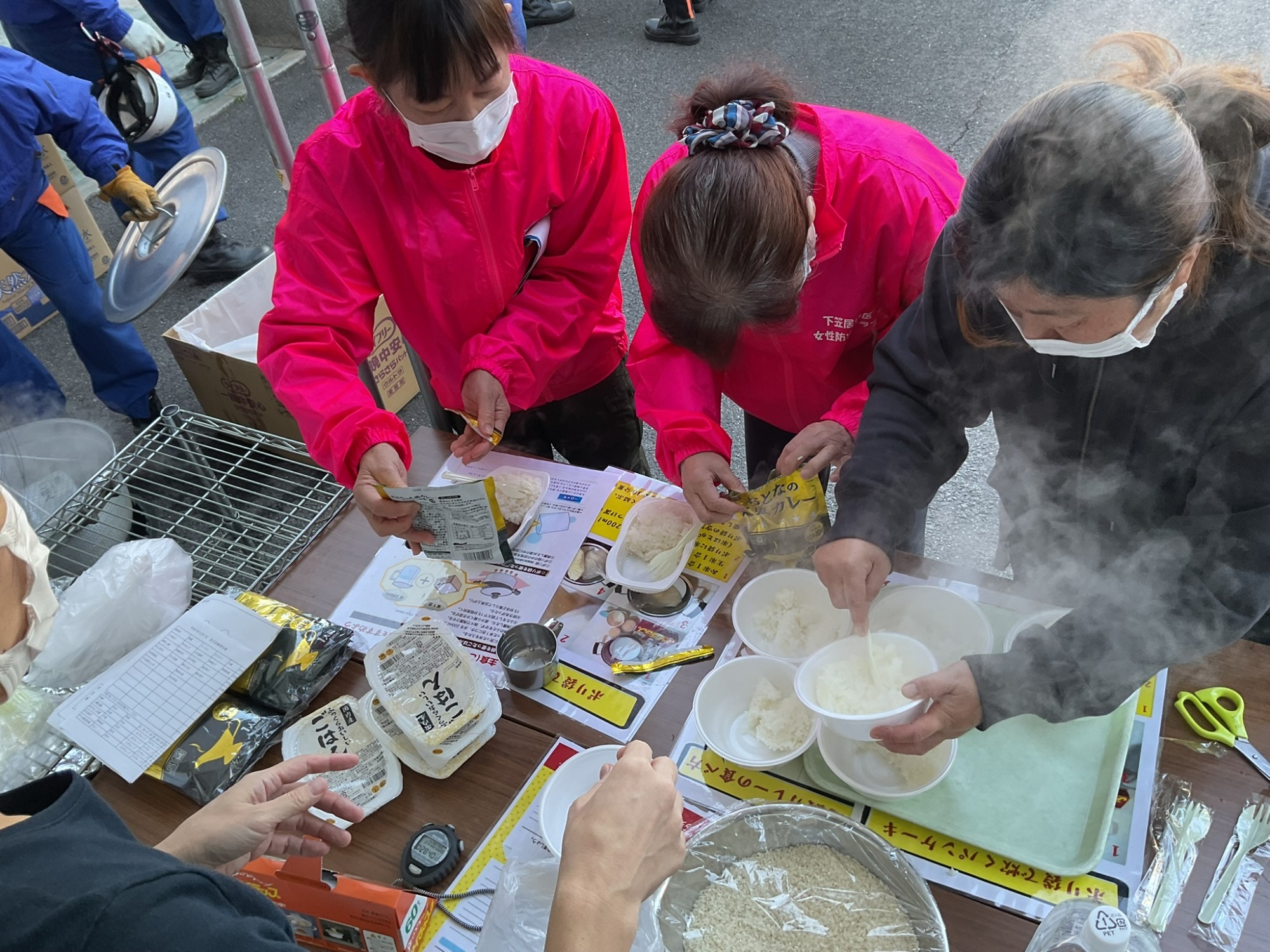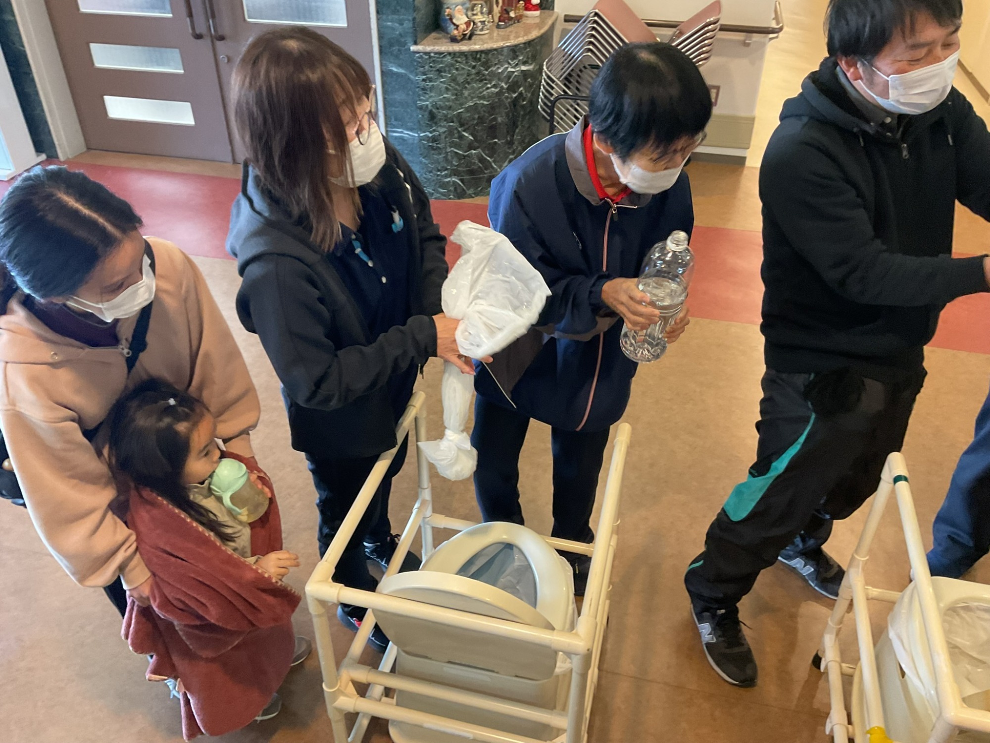 災害時に起きるであろう事をまとめたビデオを見て勉強をし、災害用のトイレの使用方法や備蓄用のレトルト食品の炊き出し訓練、包装食袋(アイラップ)を使った非常食メニューを知り、土嚢袋の作り方や、置き方などを詳しく教えていただきました。いざという時のために、職員一人一人が迅速な対応ができるよう、今回学んだ事を活かせるようにしたいと思います。