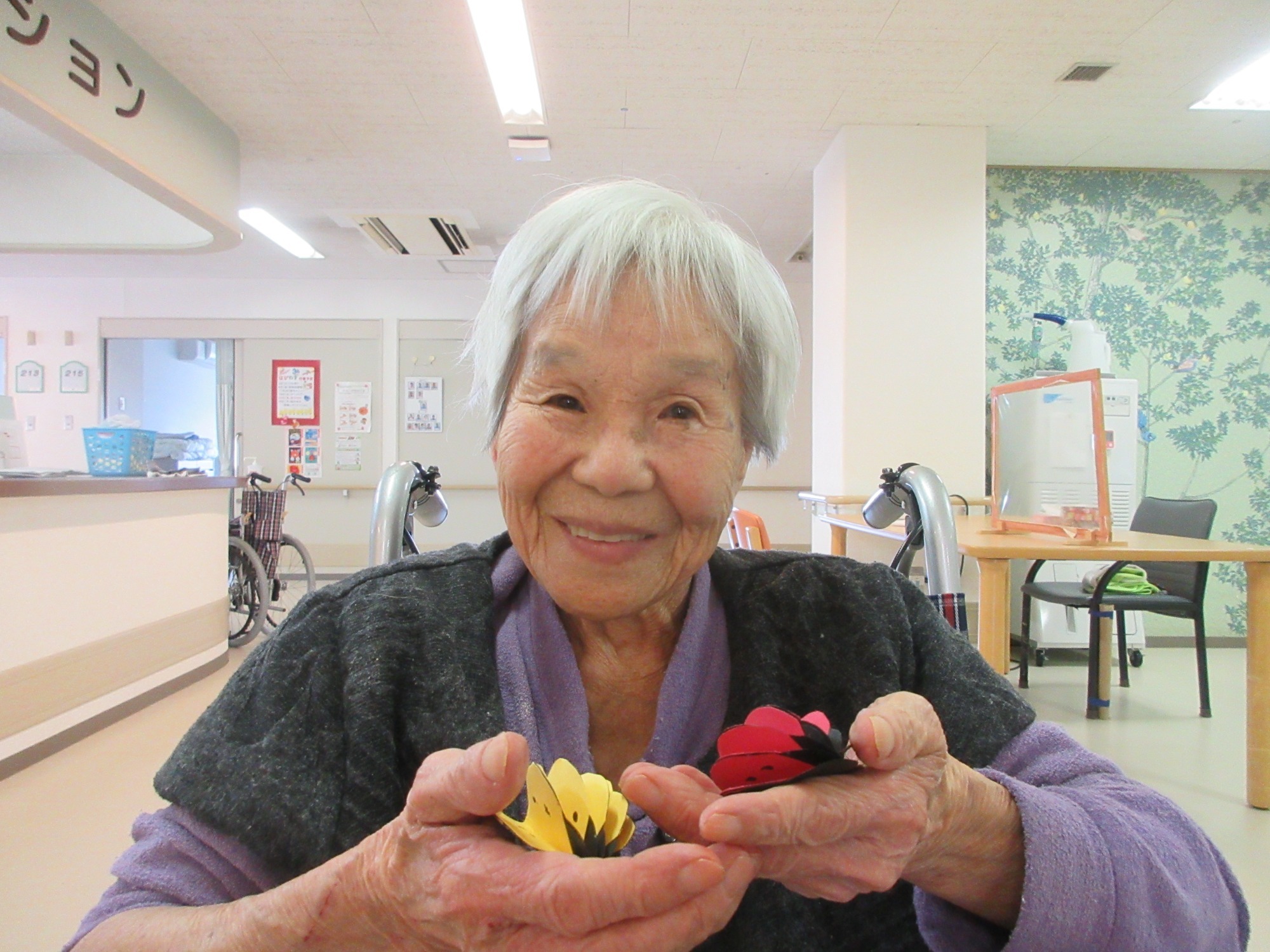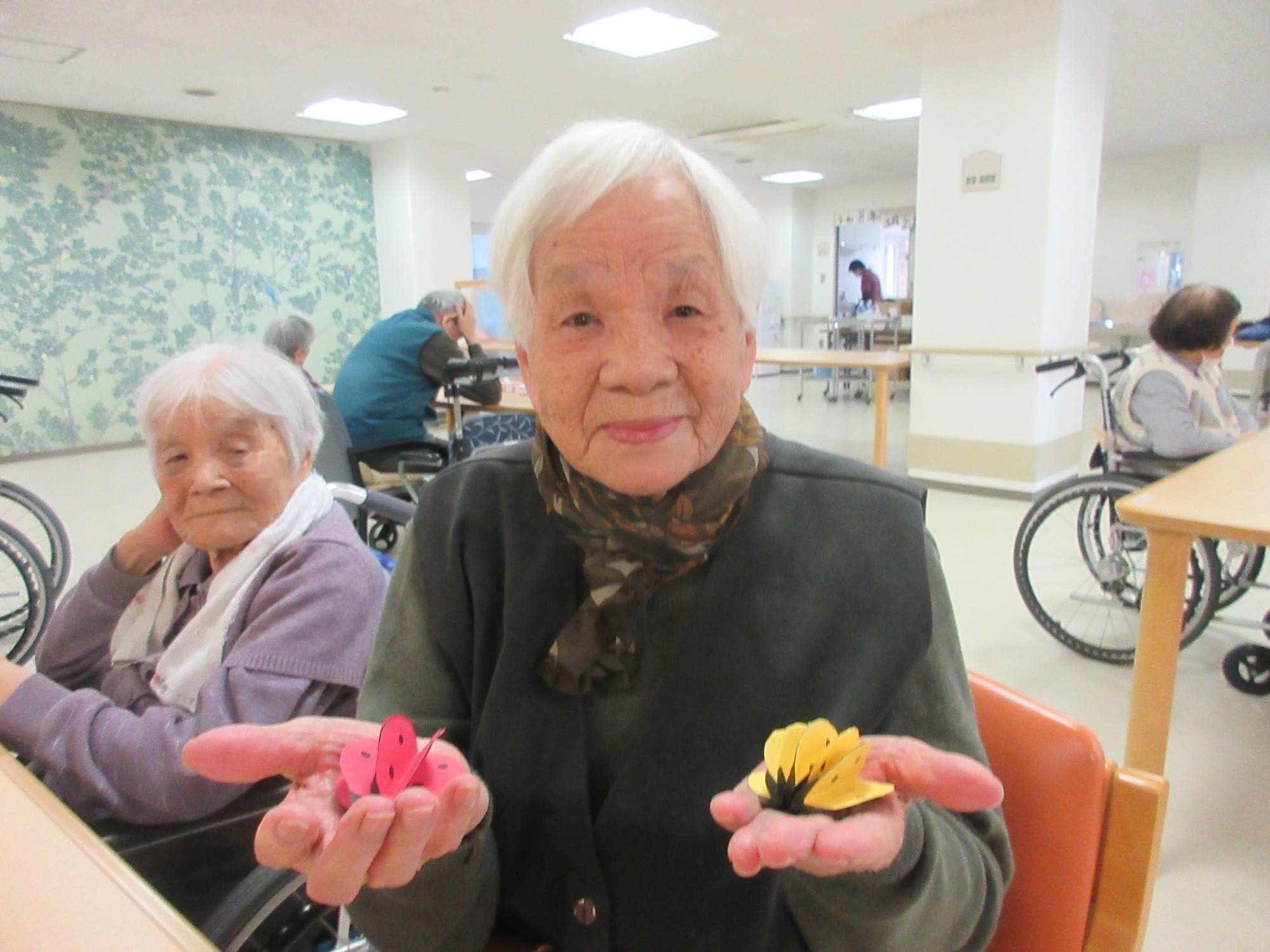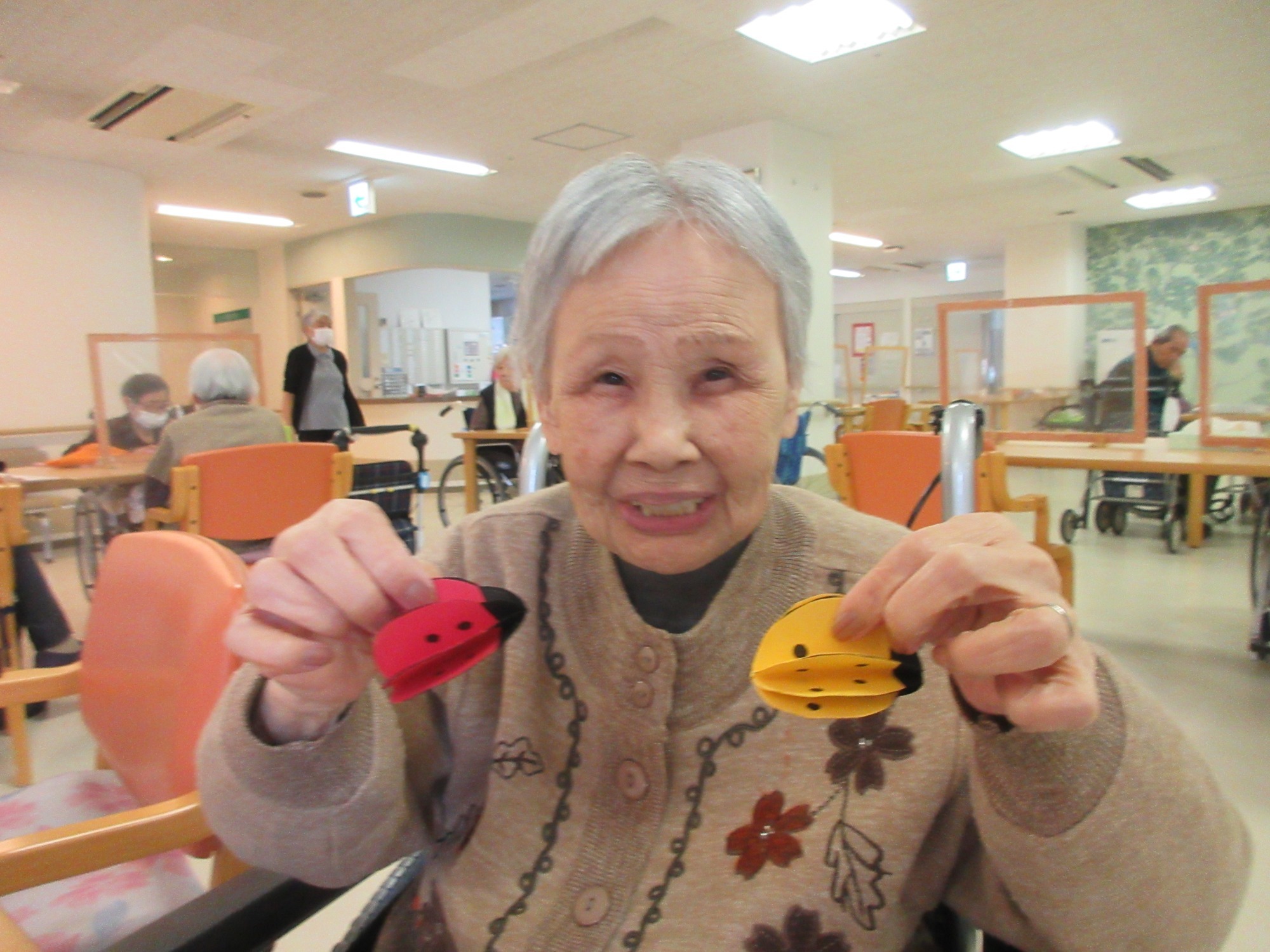 そんな気持ちにさせてくれる3月にピッタリな壁画を作ってみました。入所者の皆様には、丸くて赤や黄色のフォルムと黒い水玉模様が特徴的な昆虫「テントウムシ」を画用紙を使用して一緒に作ってみました。