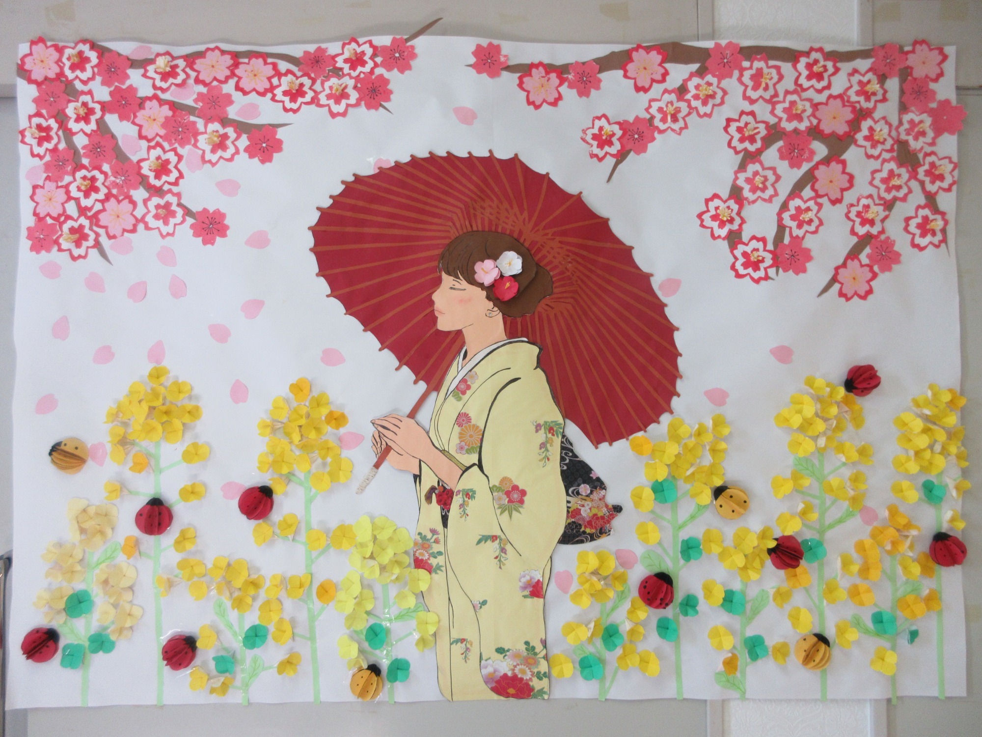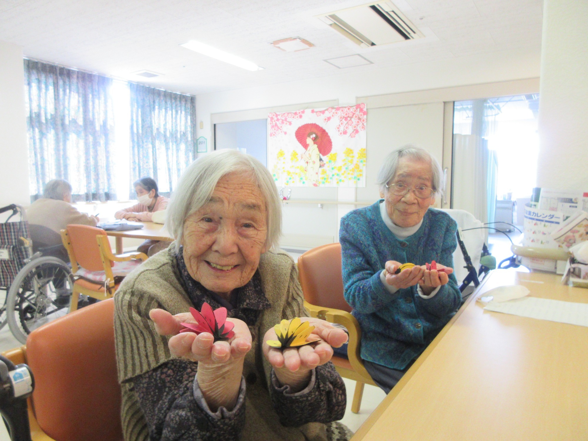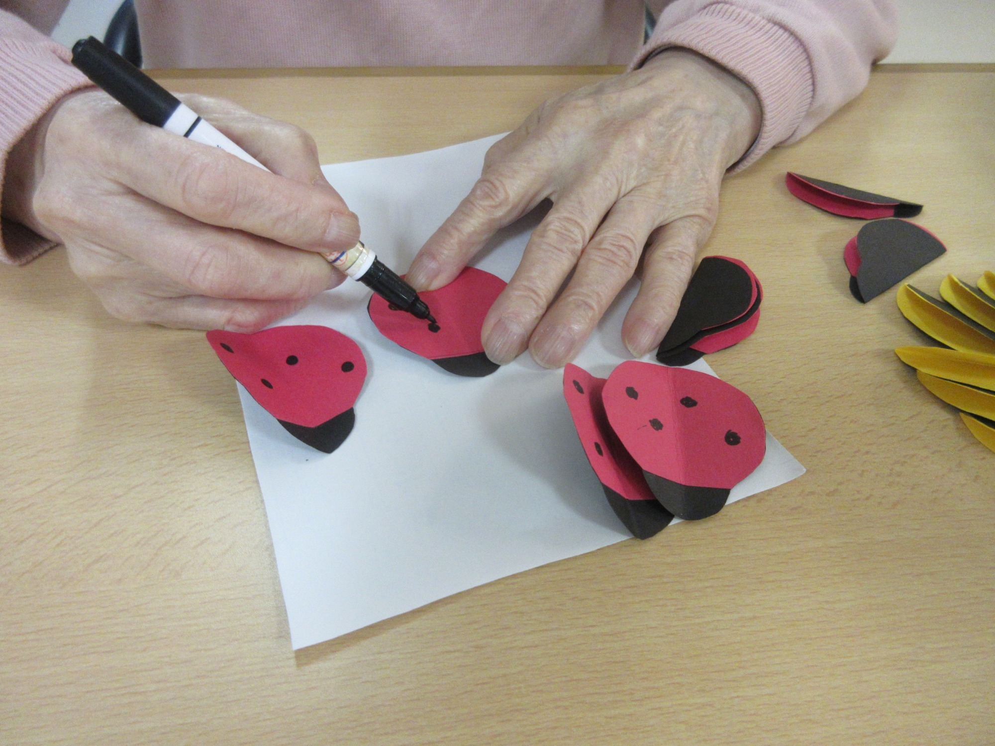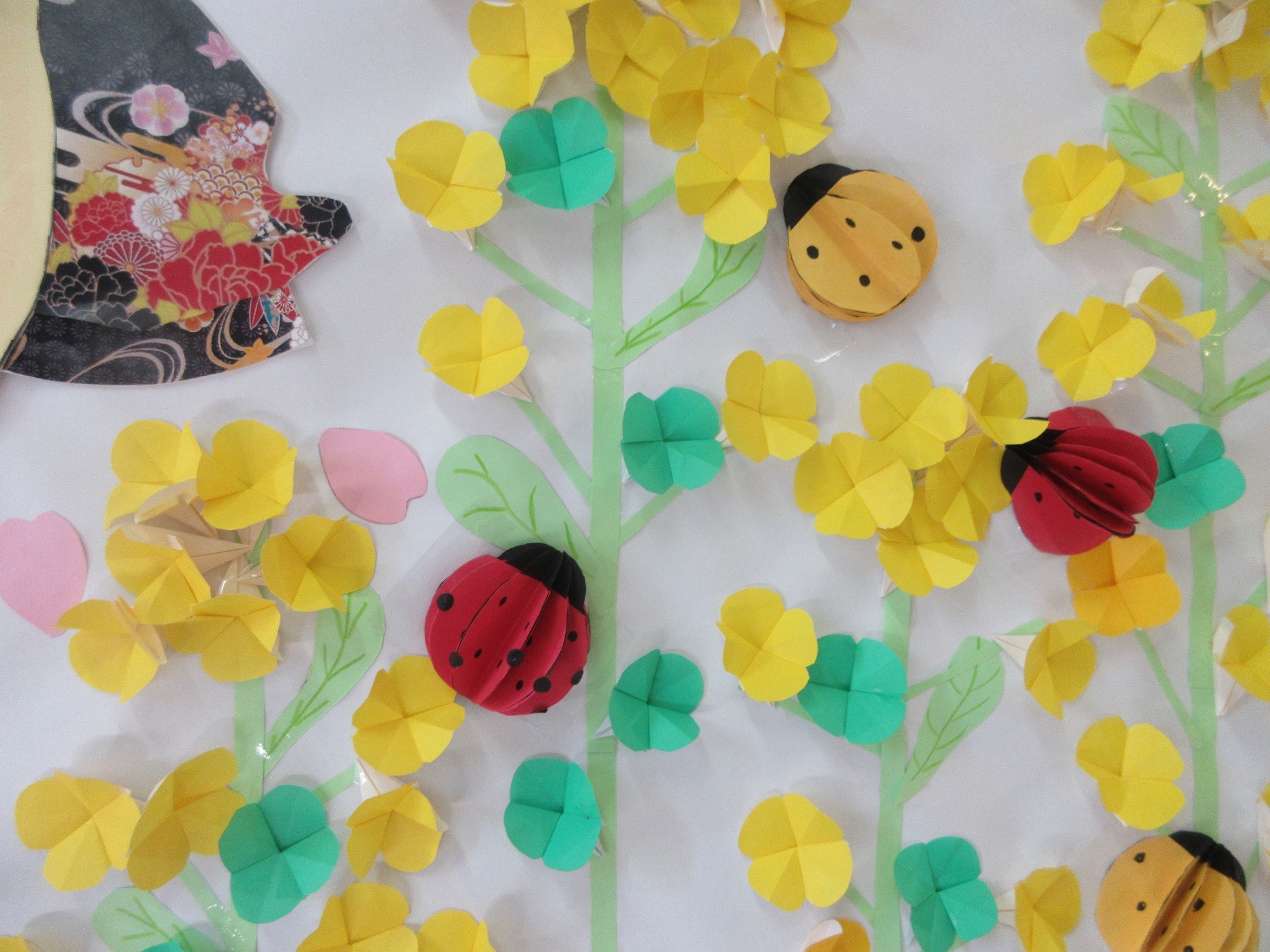 そんな気持ちにさせてくれる3月にピッタリな壁画を作ってみました。入所者の皆様には、丸くて赤や黄色のフォルムと黒い水玉模様が特徴的な昆虫「テントウムシ」を画用紙を使用して一緒に作ってみました。