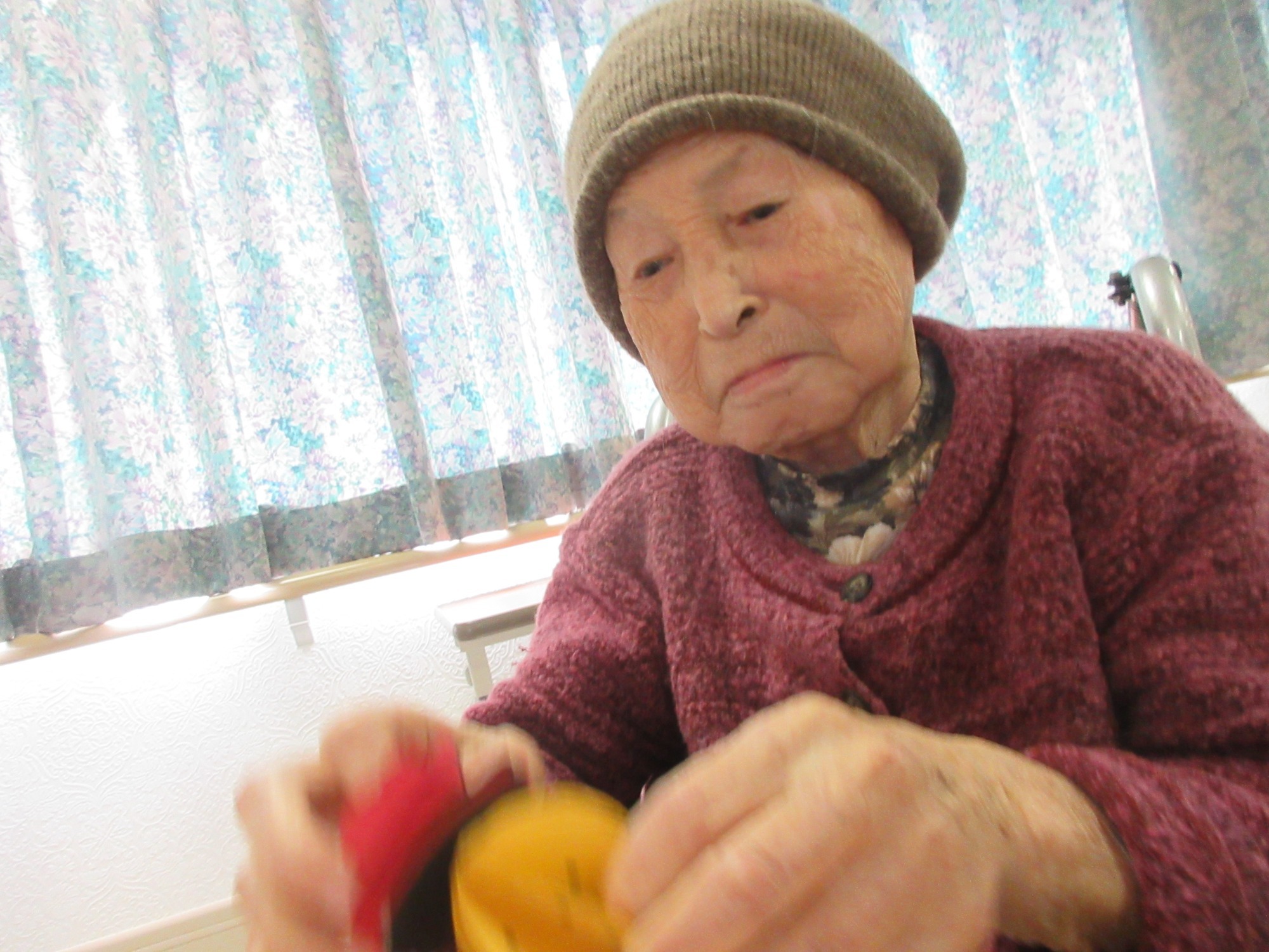 また、お手玉を使って、元気のでる曲に合わせながら、お手玉を上にあげたり、左右に動かしたりして遊んでいただきました。久しぶりにお手玉を上にあげる動作に、戸惑う方もいらして難しかった方もいましたが、「懐かしいね」と言いながら、上手にポンポンとお手玉を上げる方もいらっしゃいました。