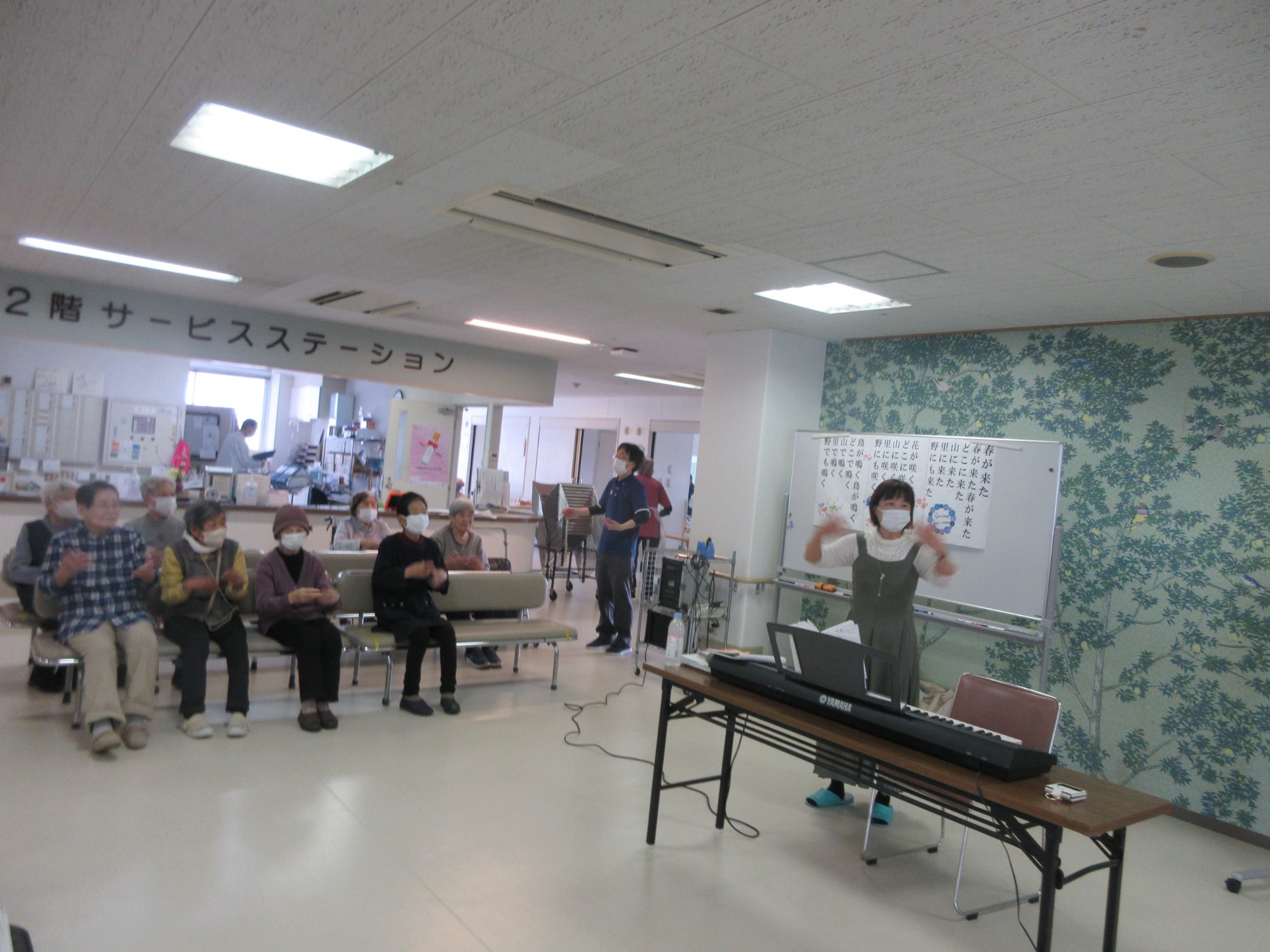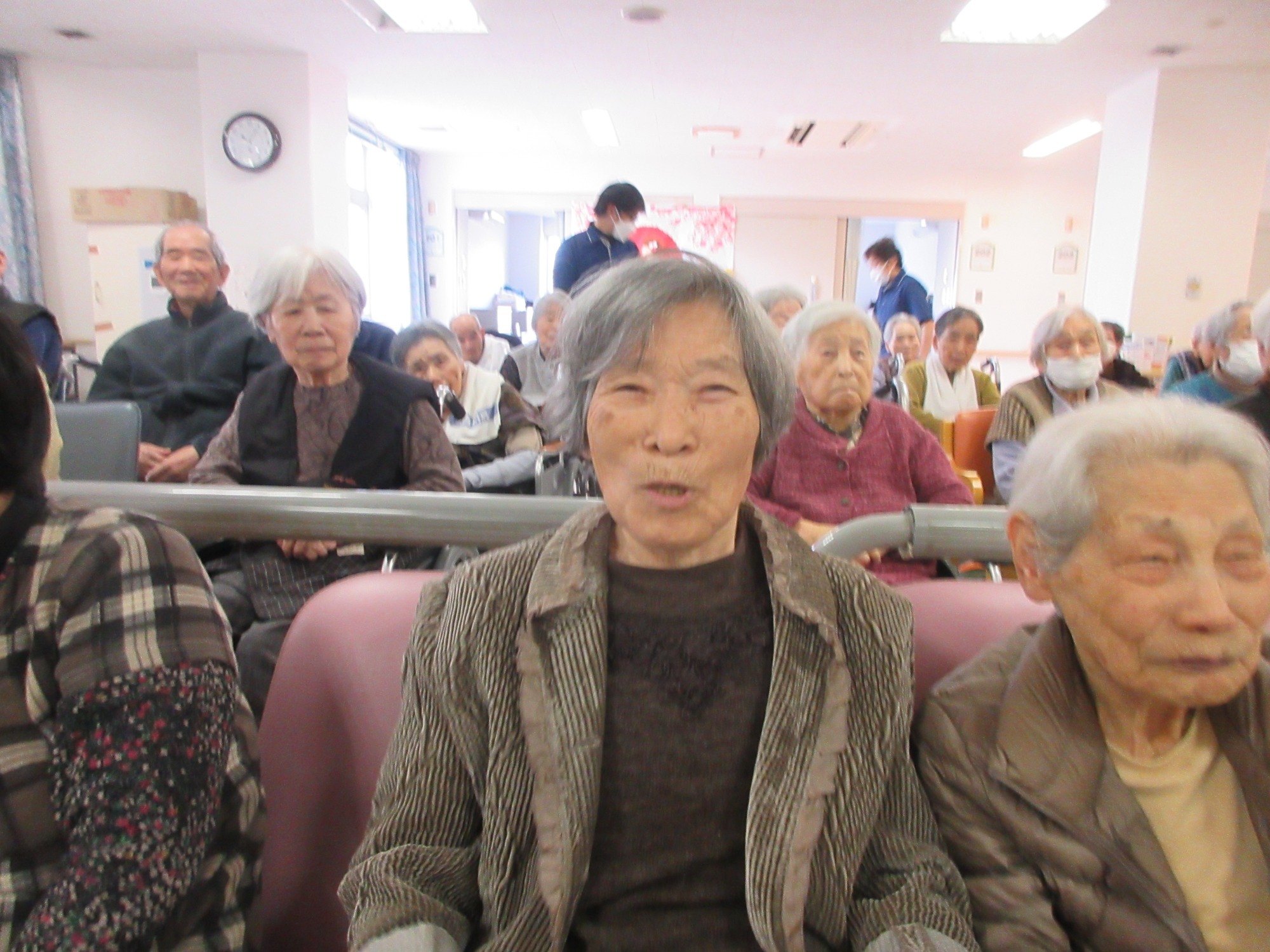歌を歌う事を忘れ、一生懸命に手を動す事に集中される方や、既に動作は諦めて歌だけ歌う方等、皆さん自己流で楽しんでおられました。音楽を使用して、皆さんの健康を促進する事が目的ですので、自分ができる事をしていただいて、楽しんでくださるように職員もサポートしています。